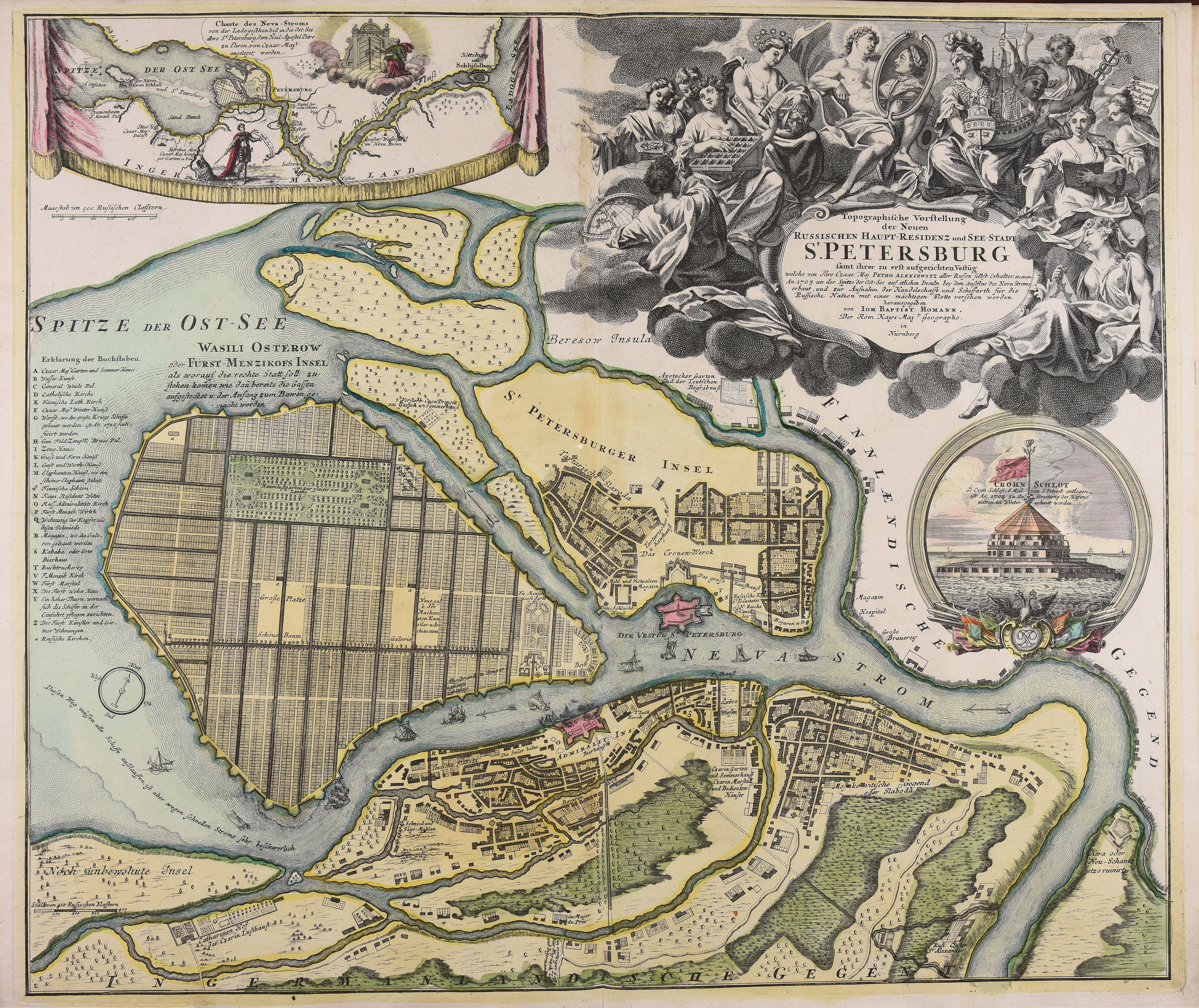 | Topographische Vorstellung der Neuen Russischen Haupt-Residenz- und See-Stadt St. Petersburg samt ihrer zu erst aufgerichten Vestung : welche von Ihro Czaar Maj. Petro Alexiewitz aller Russen selbst Erhalter etc., etc., etc. An 1703 an der Spitze der Ost-See auf etlichen Insuln bey dem aussflus des Neva Stroms erbaut, und zur Aufnahm der Handelschafft und Schiffarth für die Russische Nation mit einer mächtigen Flotte versehen worden |