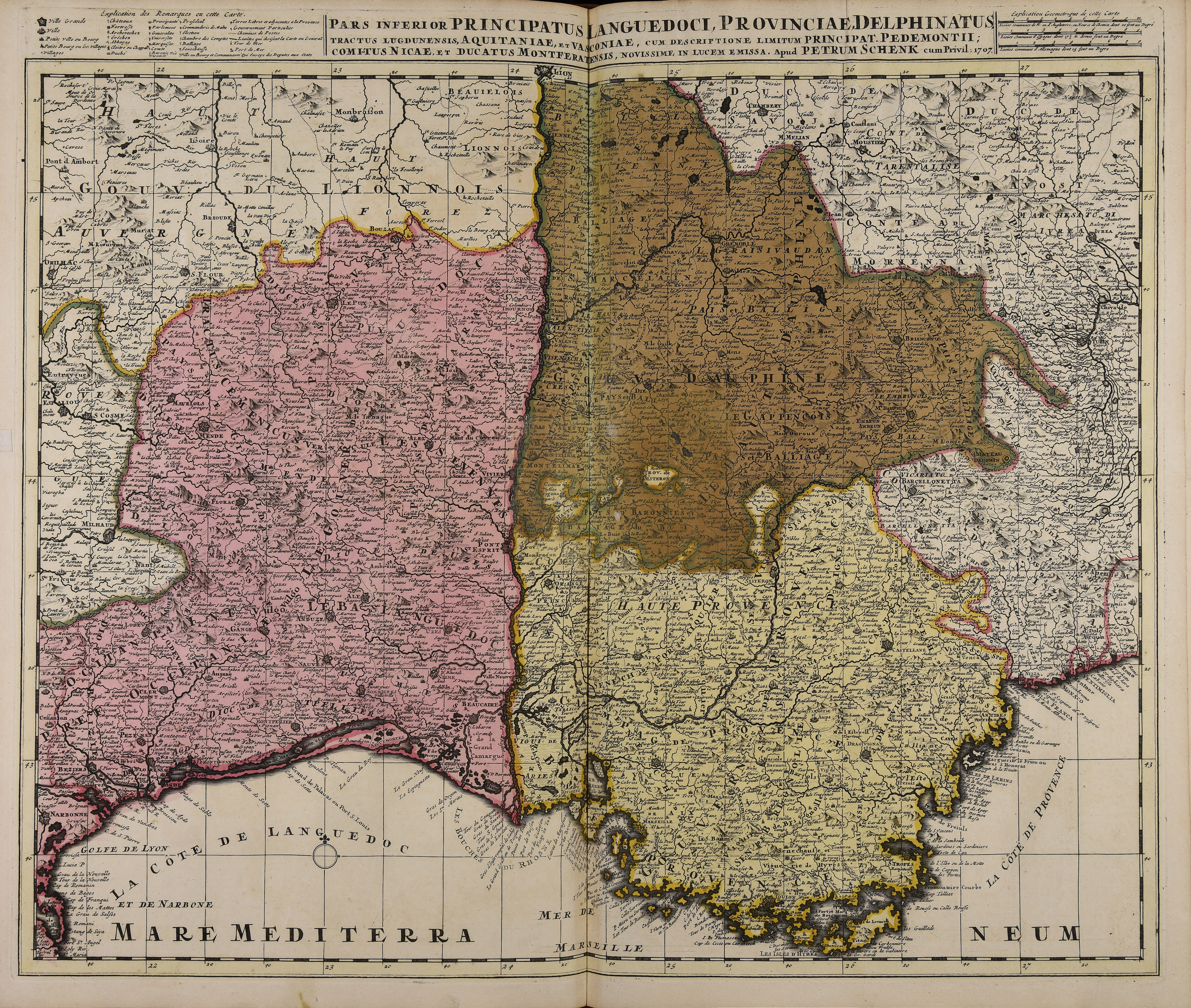 | Pars inferior principatus Languedoci provinciae Delphinatus tractus Lugdunensis Aquitaniae et Vasconiae cum descriptione limitum principat. Pedemontii comitus Nicae et ducatus Montferatensis novissime in lucem emissa |