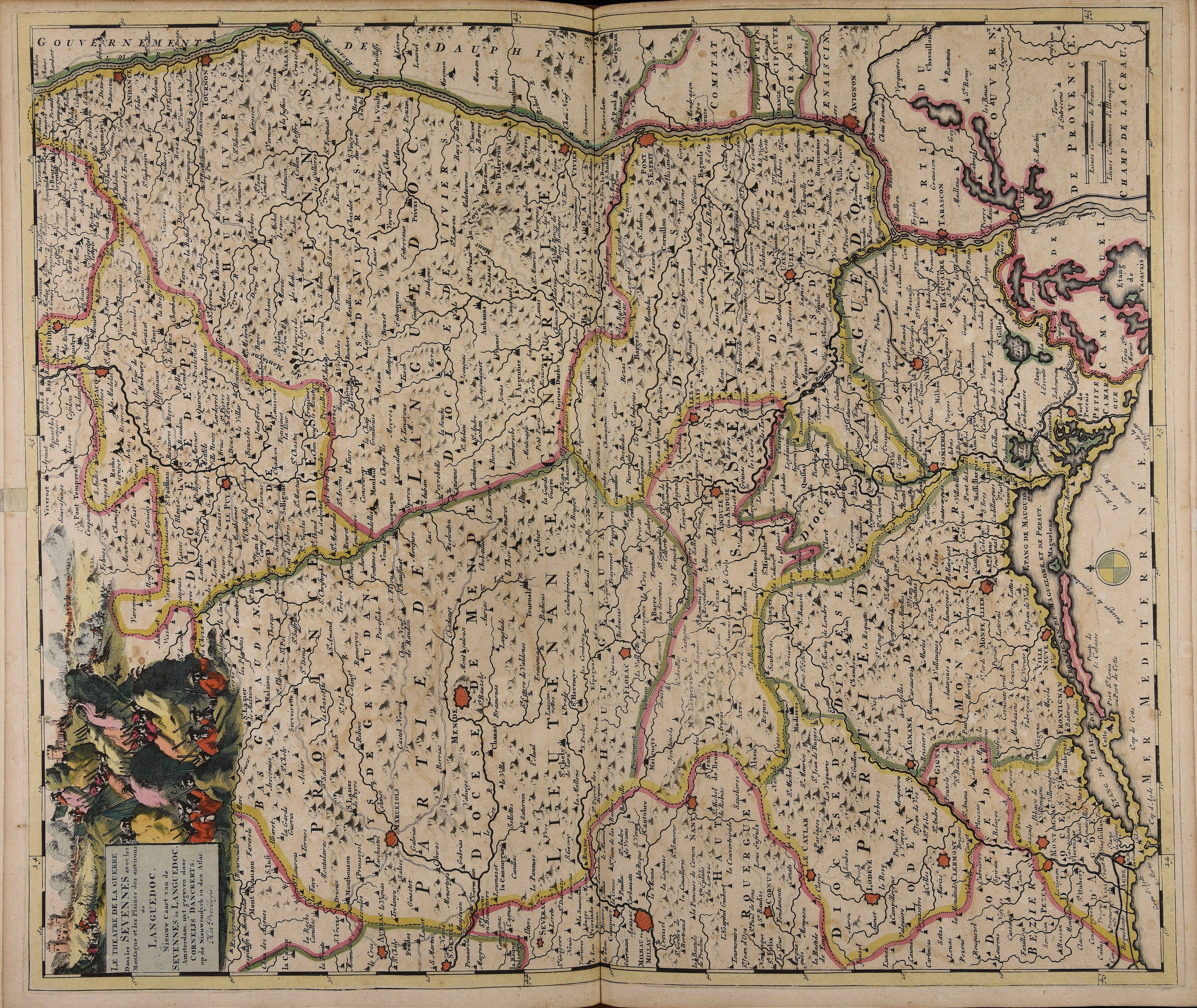| Le theatre de la guerre dans les Sevennes avec les montagne et les plaines des environs de Languedoc = Nieuwe Caart van de Sevennes in Languedoc |