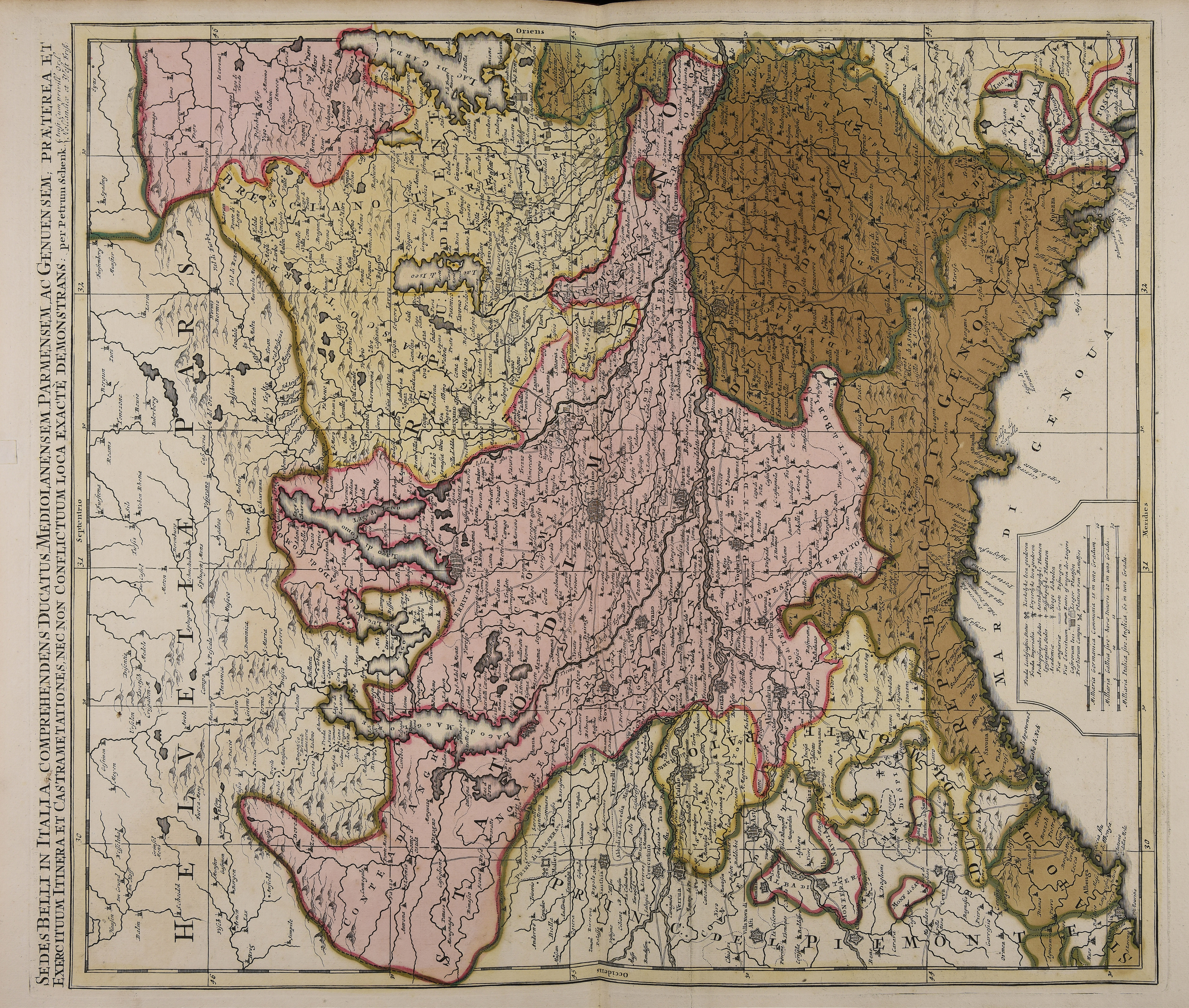 | Sedes belli in Italia comprehendens ducatus Mediolanensem, Parmensem ac Genuensem praeterea et exercituum itinera et castrametationes nec non conflictuum loca exactè demonstrans |