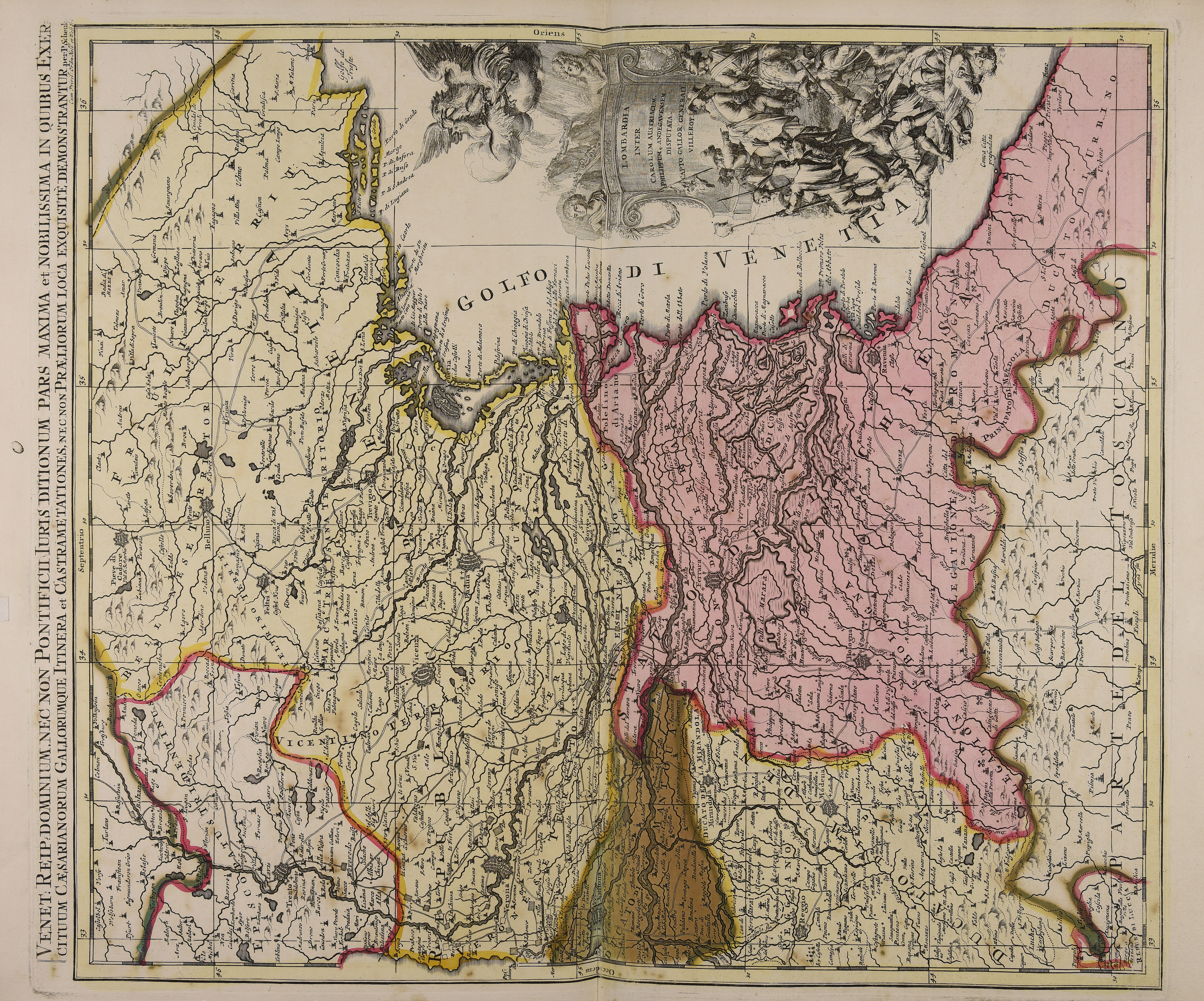 | Venet. Reip. dominium nec non pontificii iuris ditionum pars maxima et nobilissima in quibus exercituum caesarianorum Gallorumque itinera et castrametationes nec non praeliorum loca exquisitè demonstrantur |