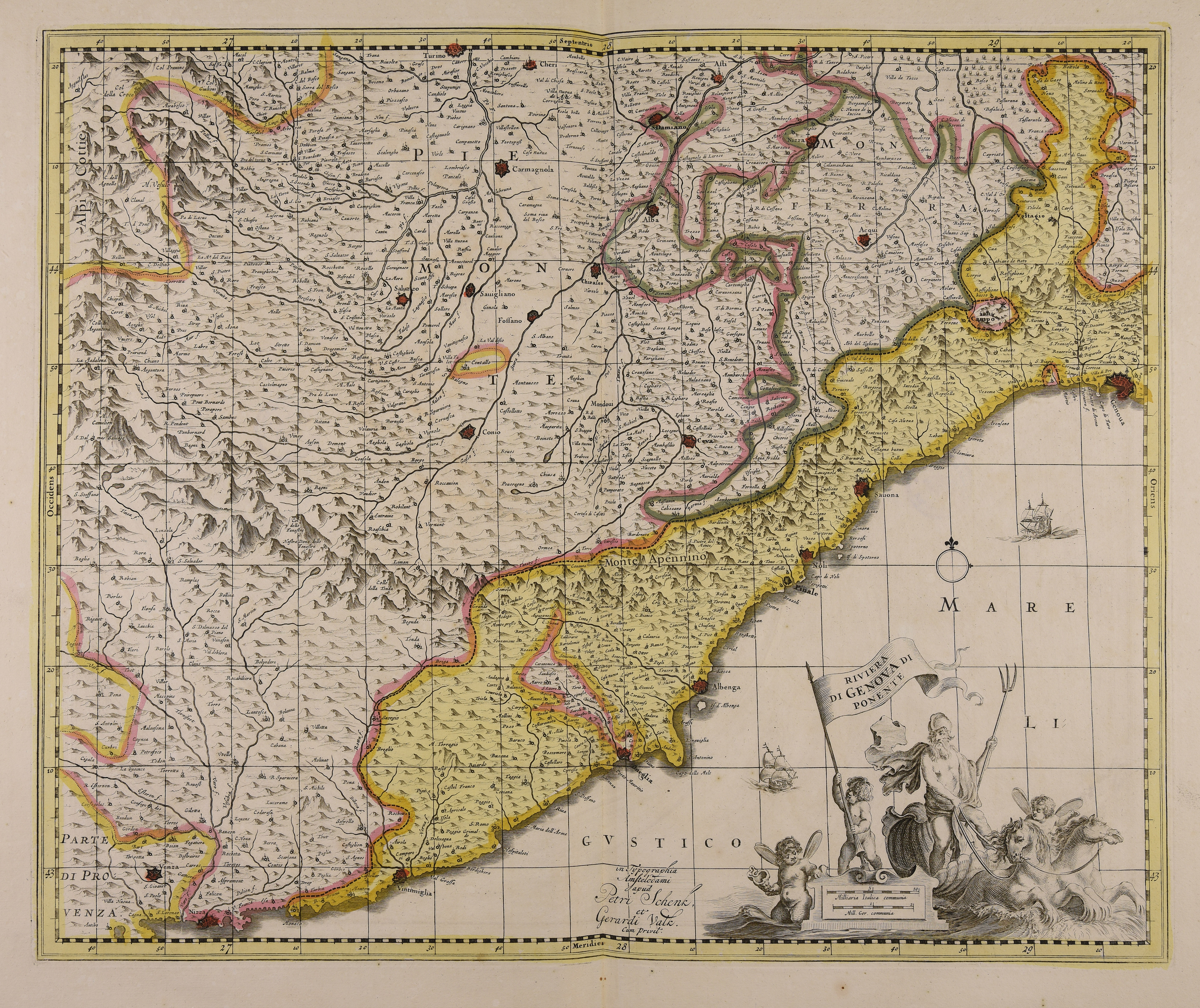 Calcografia; 422x515 mm; scala 1:450.000; pubblicata nel 1710 circa; (Cfr. Peter van der Krogt, Koeman's atlantes neerlandici, 't Goy-Houten, HES, 1997, vol. 5, in corso di pubblicazione)