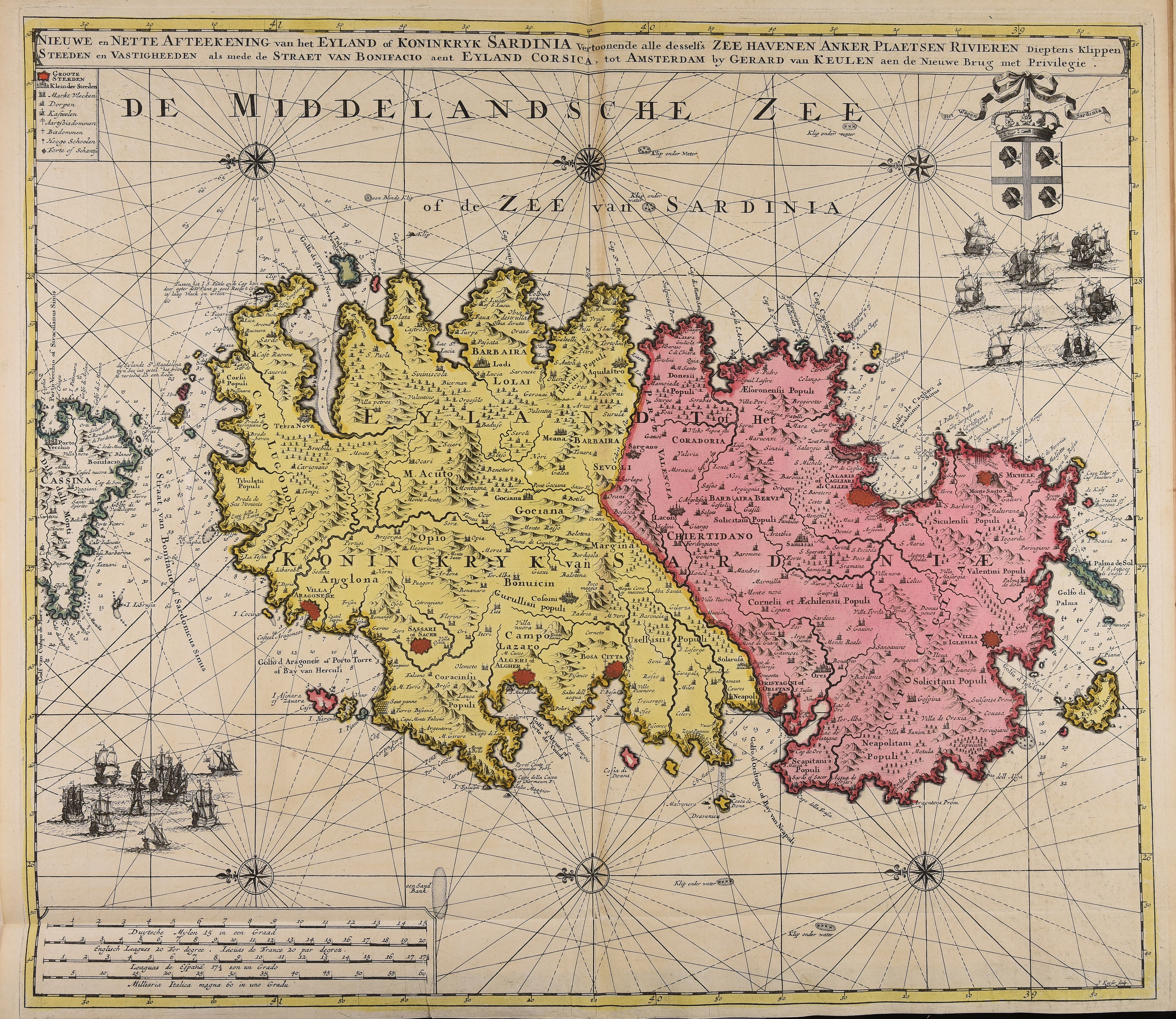 | Nieuwe en Nette Afteekening van het Eyland of Koninkryk Sardinia : Vertoonende alle desselfs Zee Havenen Anker Plaetsen Rivieren Dieptens Klippen Steeden en Vastigheeden als mede de Straet Van Bonifacio aent Eyland Corsica |