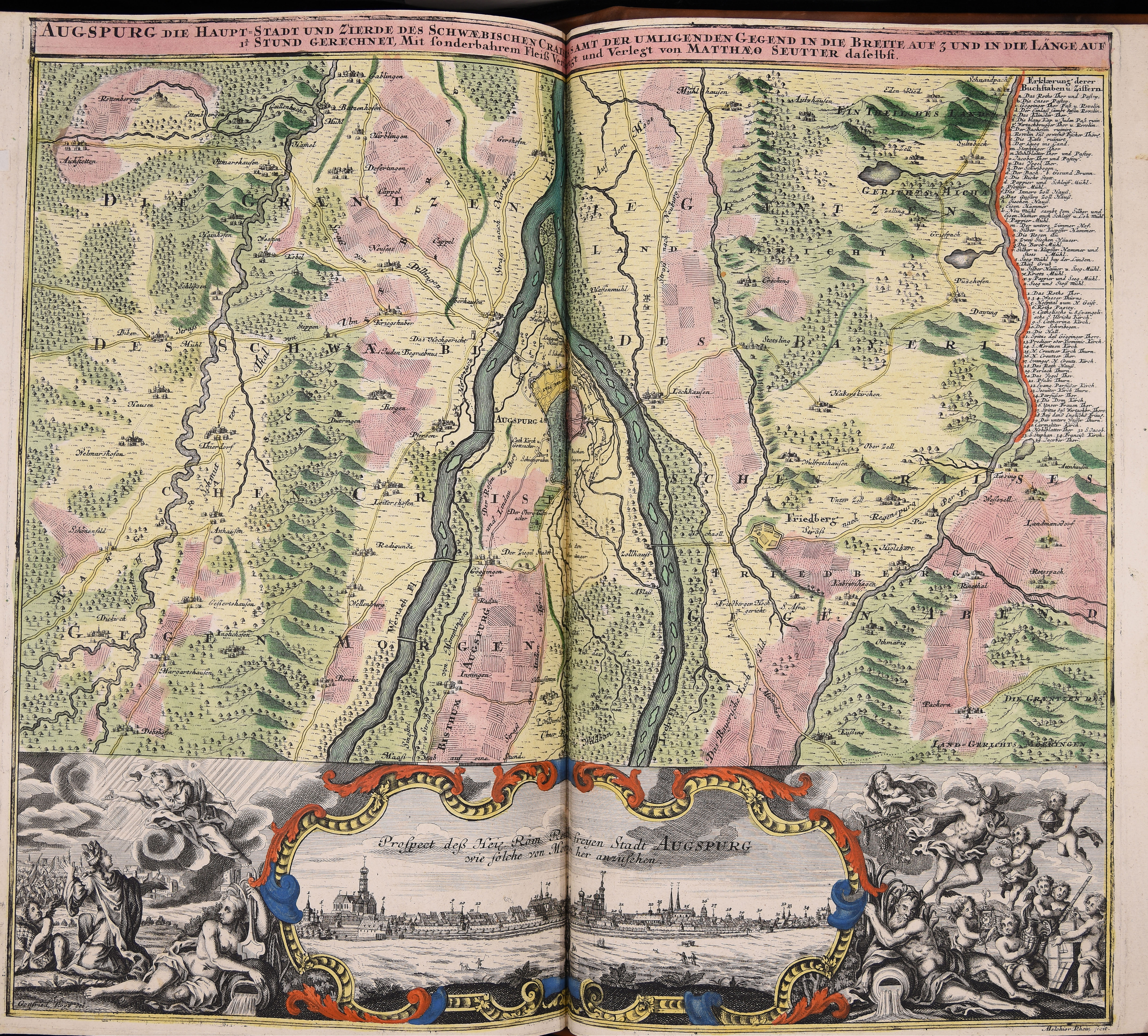 | Augspurg die Haupt-Stadt und Zierde des Schwaebischen Craises samt der Umligenden Gegend in die Breite auf 5 und in die Länge auf 1 1 |