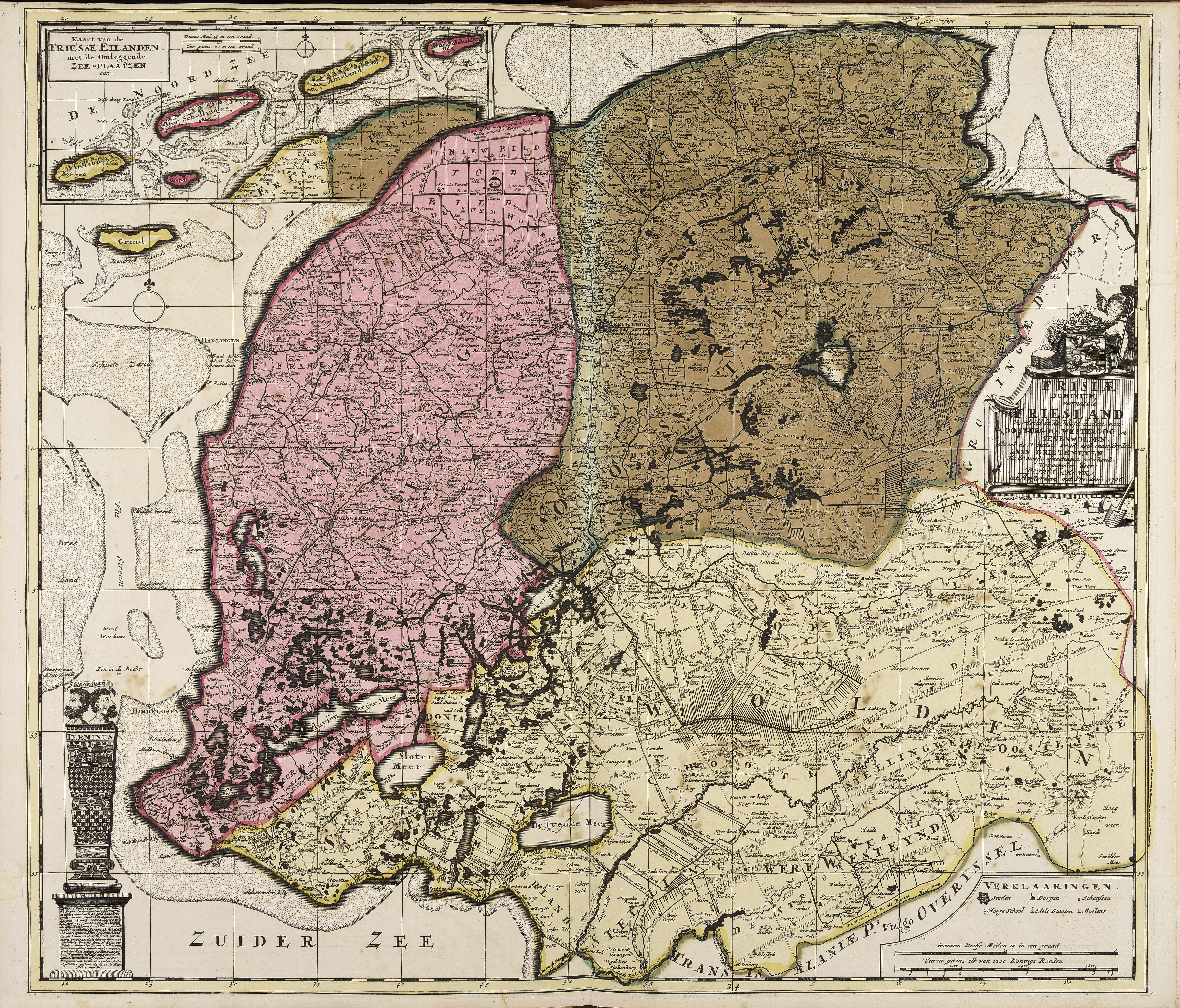 | Frisiae dominium vernacule Friesland : verdeeld in de Hoofd-deelen van Oostergoo, Westergoo en Sevenwoolden als ook de 11 steden zynde noch onderschyden in XXX Grieteneyen |