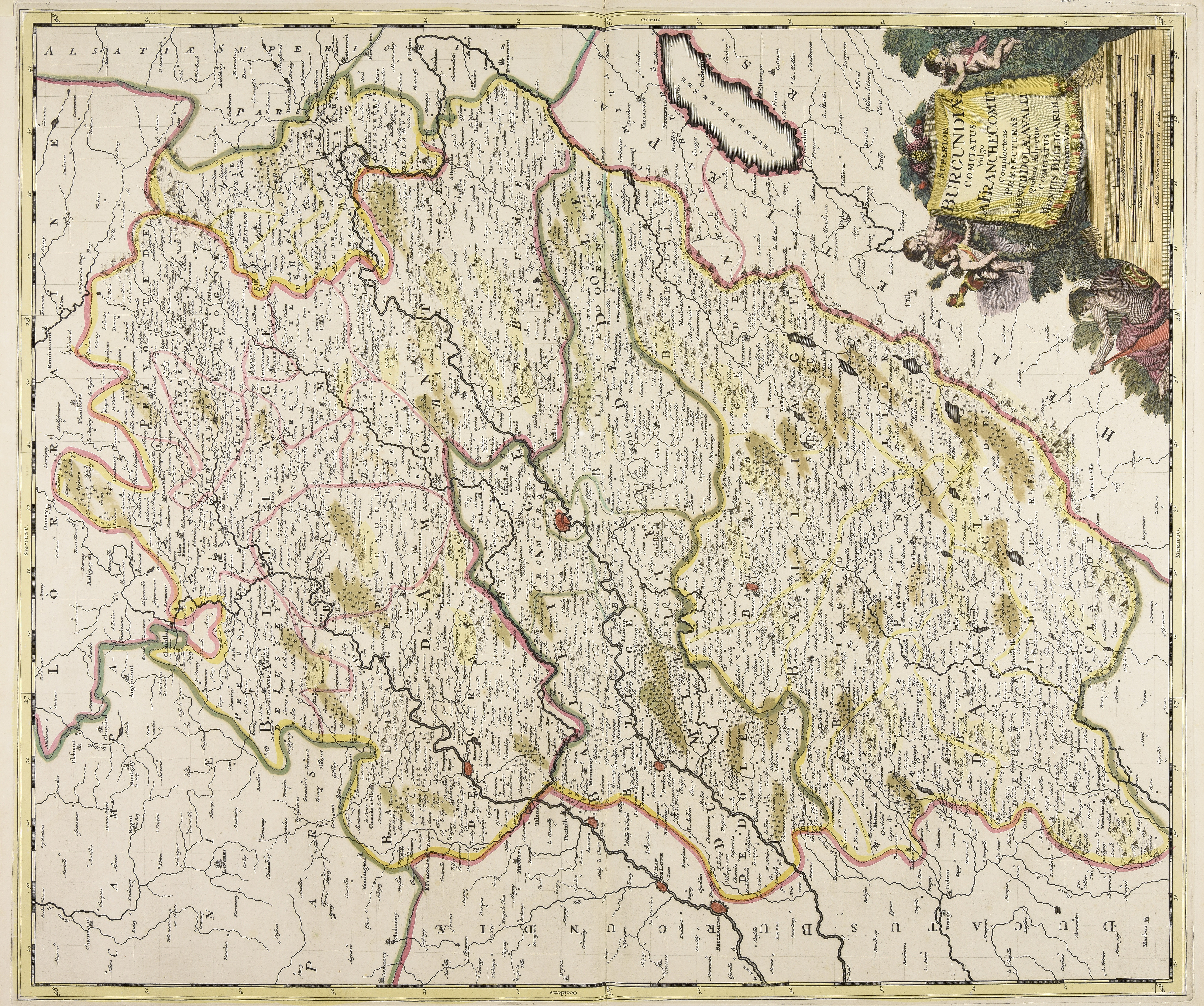 | Superior Burgundiae comitatus vulgo la Franche Comté complectens praefecturas Amontii Dolae Avalli quibus adjectus comitatus montis Belligardi |