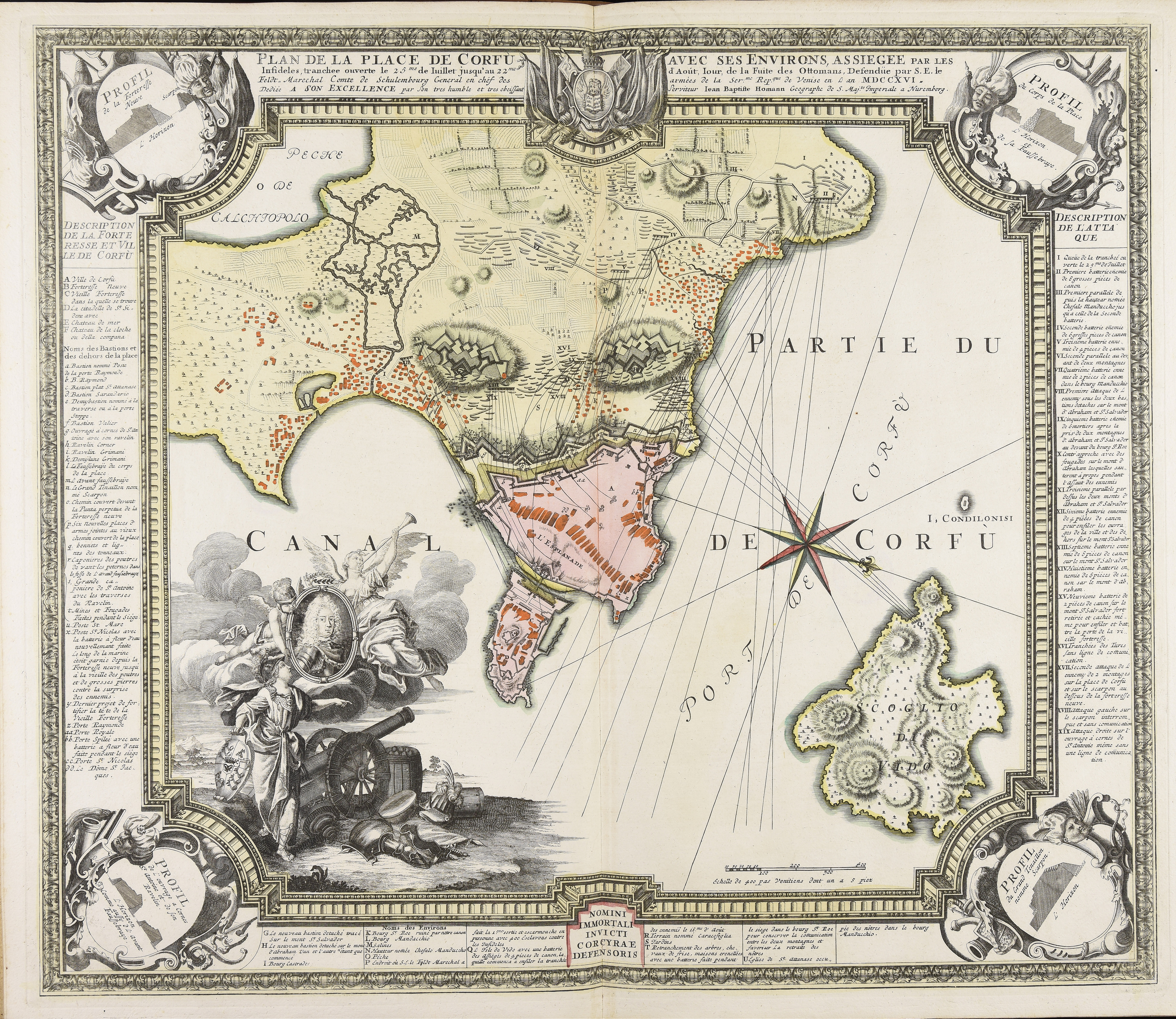 | Plan de la place de Corfù avec ses environs assiegee par les infideles tranchee ouverte le 25me de Iuillet jusqu'au 22me d'Aout iour de la fuite des Ottomans defendüe par S.E. le feldt. marechal comte de Schulembourg general en chef des armées de la ser.m |