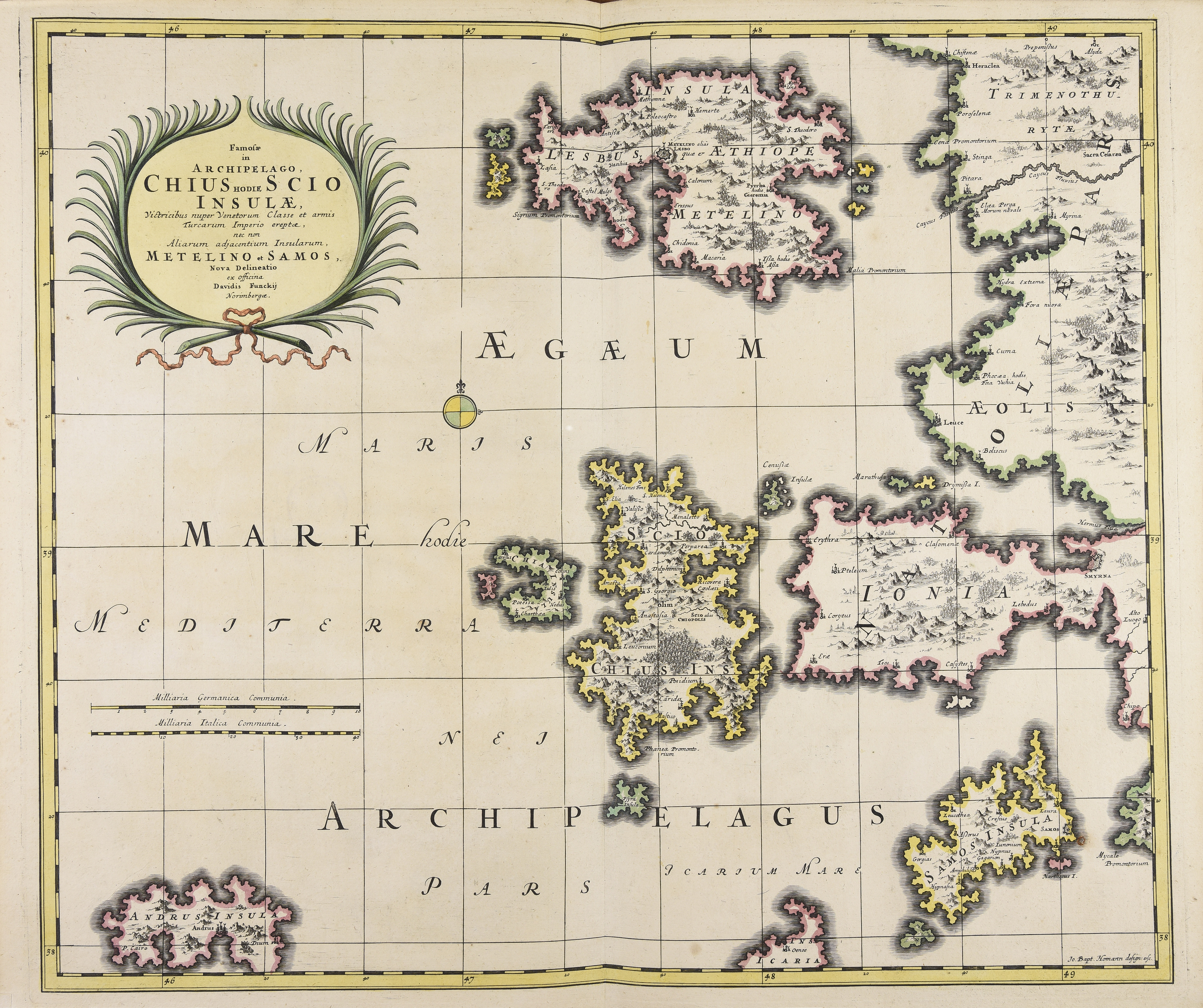| Famosae in Archipelago Chius hodie Scio insulae, victricibus nuper Venetorum classe et armis Turcarum imperio ereptae, nec non aliarum adjacentium insularum Metelino et Samos nova delineatio |