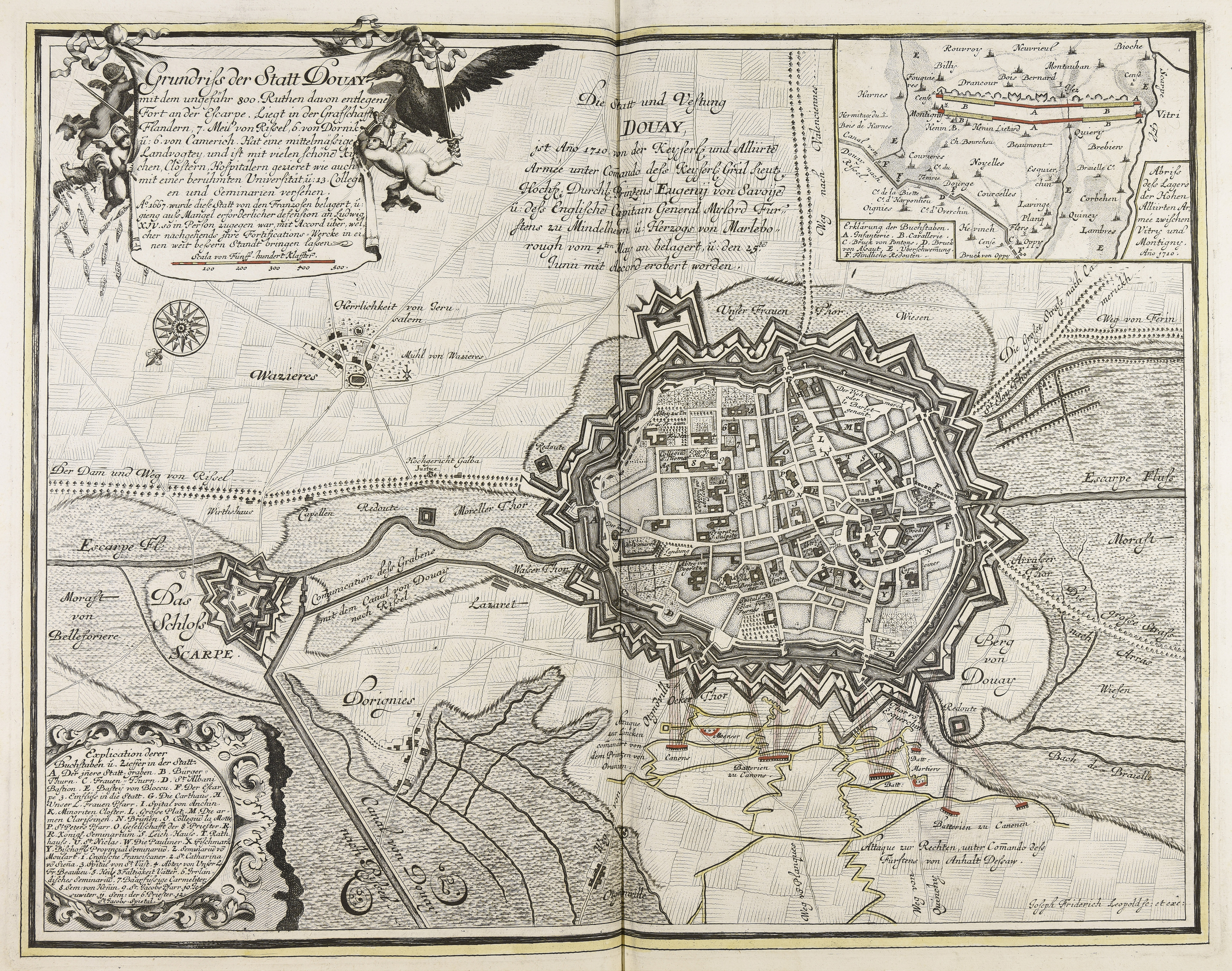 | Grundriss der Statt Douay mit dem ungefähr 800 Ruthen davon entlegene Fort an der Escarpe, liegt in der Grafsschafft Flandern, 7 Meil von Rissel, 6 von Dornik und 6 von Camerich, hat eine mittelmässige Landvogtey und ist mit vielen schönen Kirchen, Clostern, Hospitälern gezieret wie auch mit einer berühmten Universität und 13 Collegien und Seminarien versehen ... |