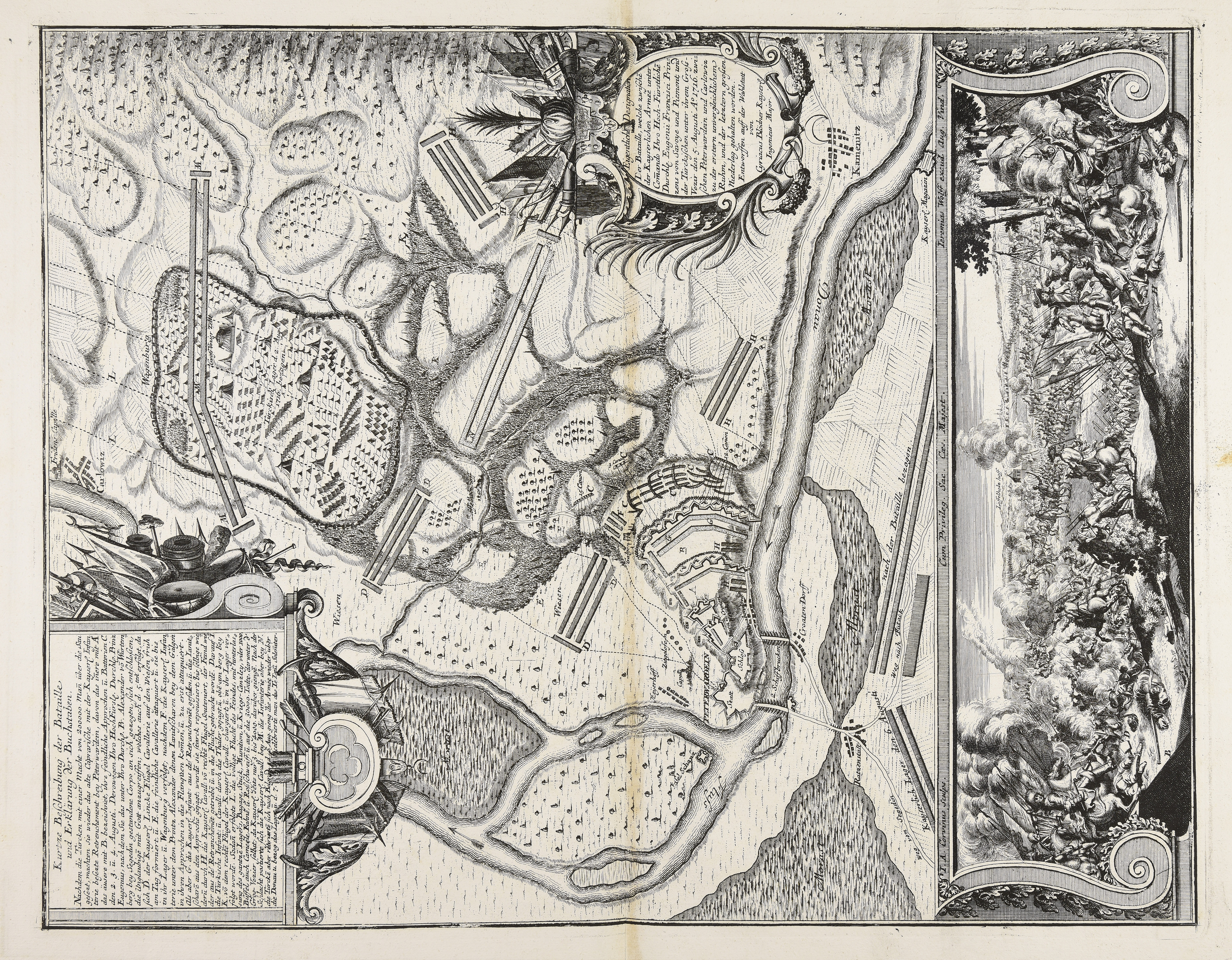 | Eigentliche Designation der Bataille welche zwischen der Kayserlichen Armée unter Commando Ihro Hoch-Fürstlichen Durchl. Eugenii Francisci Prinzens von Savoye und Piemont und der Türckischen unter ihrem Gross-Vezir den 5. Augusti Ao. 1716 zwischen Peterwardein und Carlowiz zu der erstern unvergleichlichem Ruhm ... |