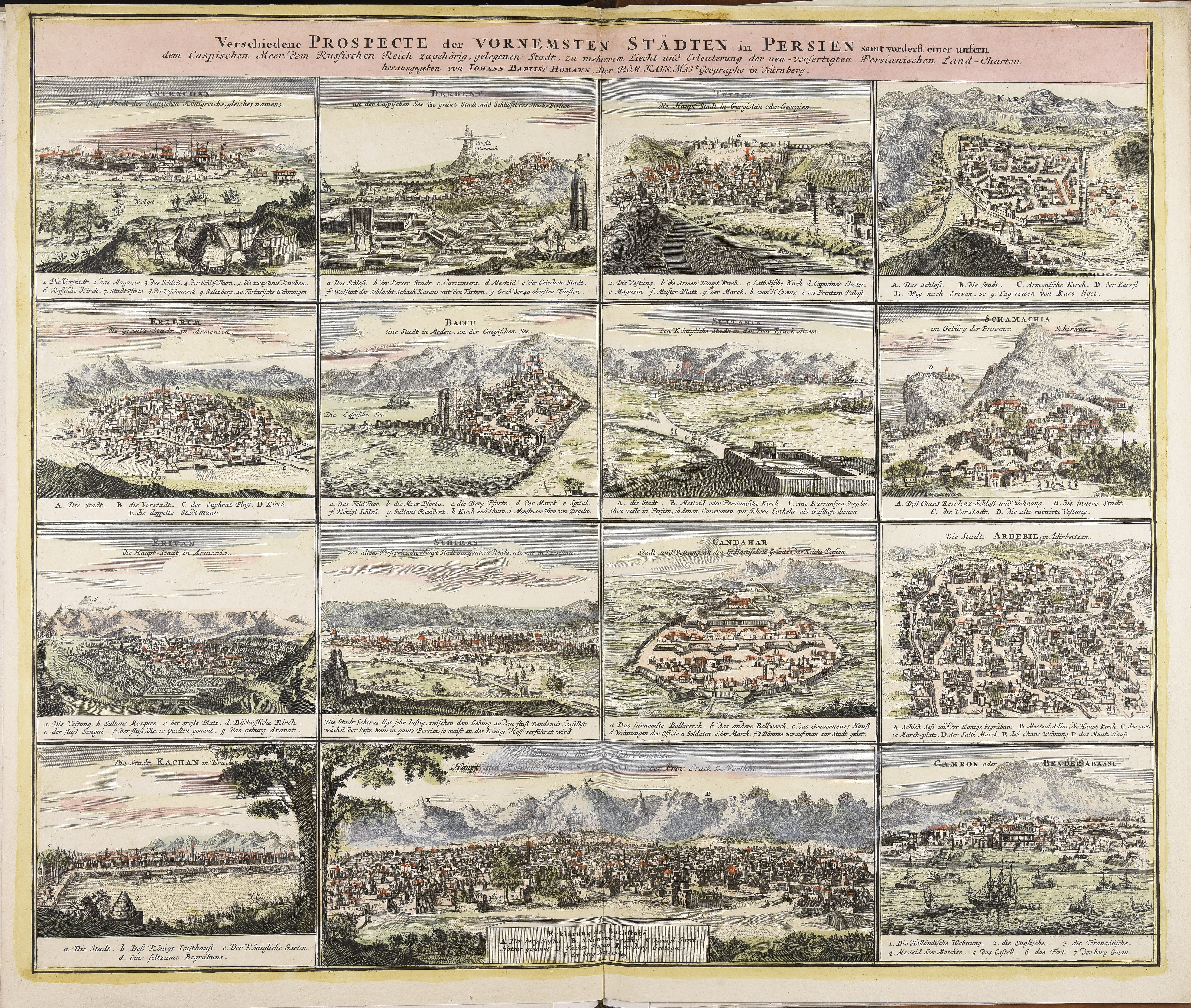 | Verschiedene Prospecte der vornemsten Städten in Persien samt vorderst einer unfern dem Caspischen Meer, dem Russischen Reich zugehörig, gelegenen Stadt, zu mehrerem Liecht und Erlauterung der neu-verfertigten Persianischen Land-Charten |