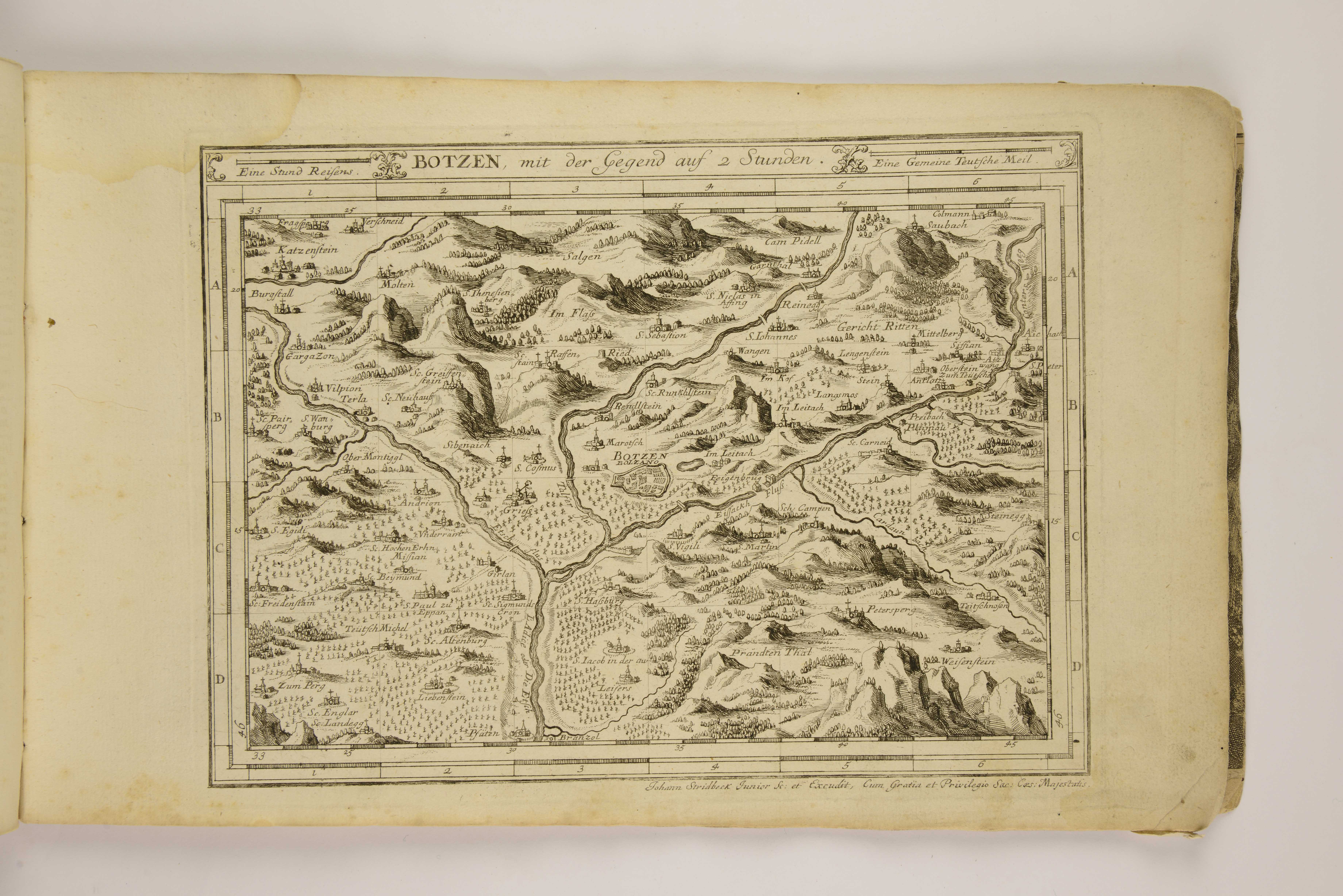 Calcografia; 172x235 mm. Pubblicata in Johann Stridbeck, Curioses Staats und Kriegs-Theatrum dermahliger Begebenheiten im Tyrol ..., Augsburg, Johann Stridbeck, [tra il 1711 e il 1714]