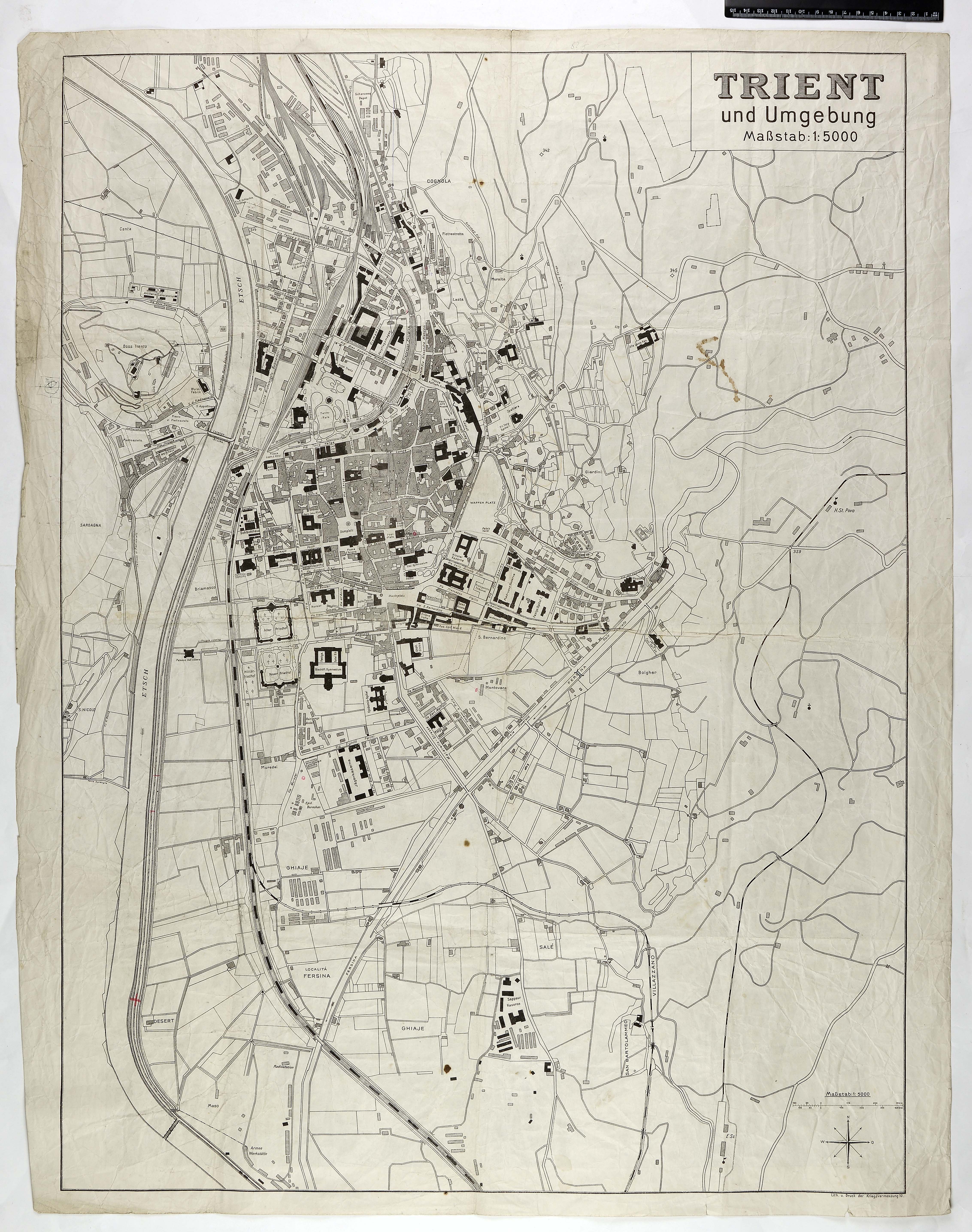 Litografia; 83x62 cm; scala 1:5.000; pubblicata probabilmente nel 1918; sul verso altra carta topografica annullata