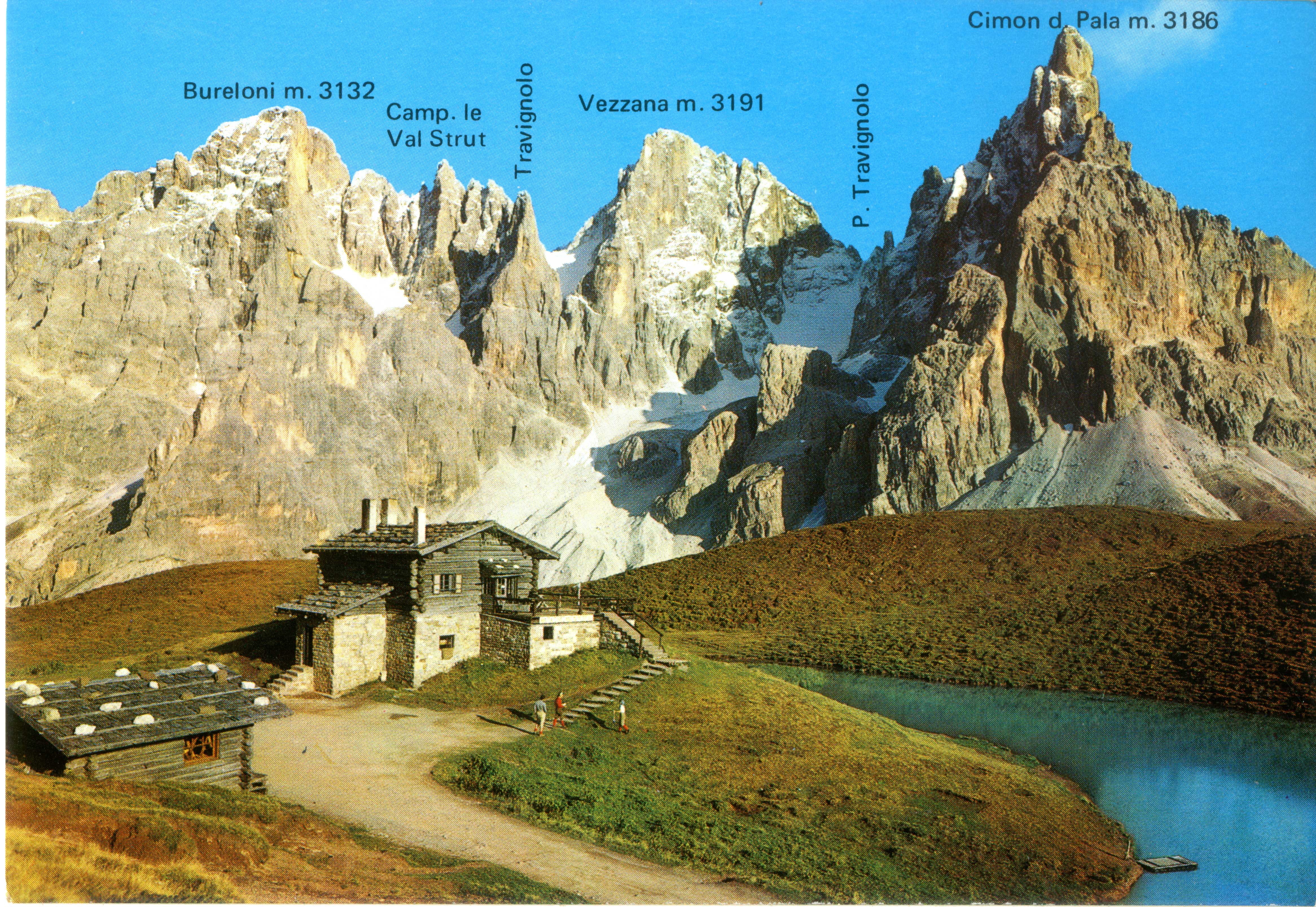 | Dolomiti - Passo Rolle (Trentino) Baita G. Segantini m. 2200 Veduta col laghetto, Bureloni, C. Vezzana m. 3191 e Cimon della Pala |