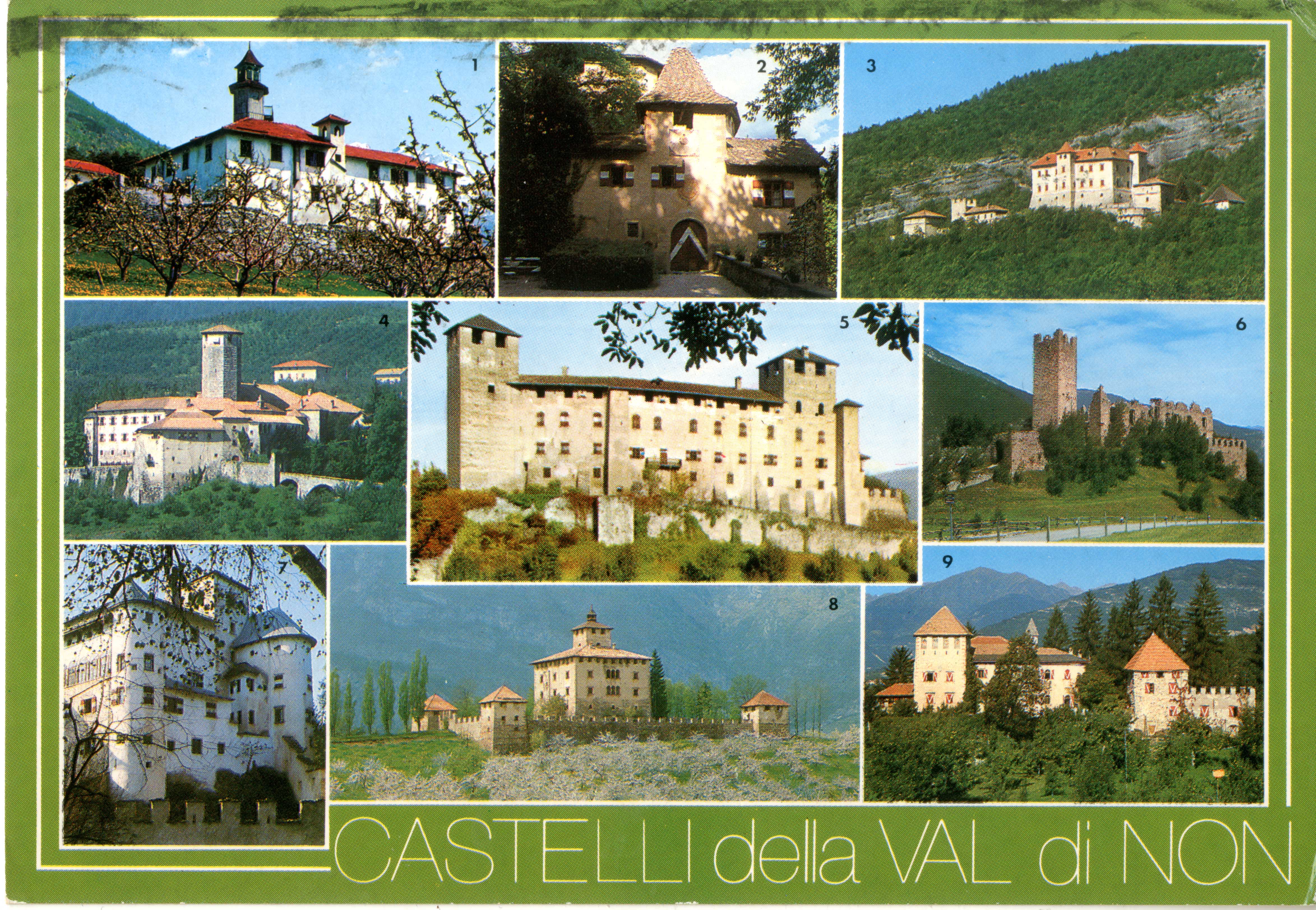102x147 mm, color. Titolo sul verso: Valle di Non (Trentino) 1. La Santa – 2. Fondo – 3. Thun – 4. Valer – 5. Cles – 6. Belfort – 7. Bragher – 8. Nanno – 9. Malgolo. Data dal timbro postale
