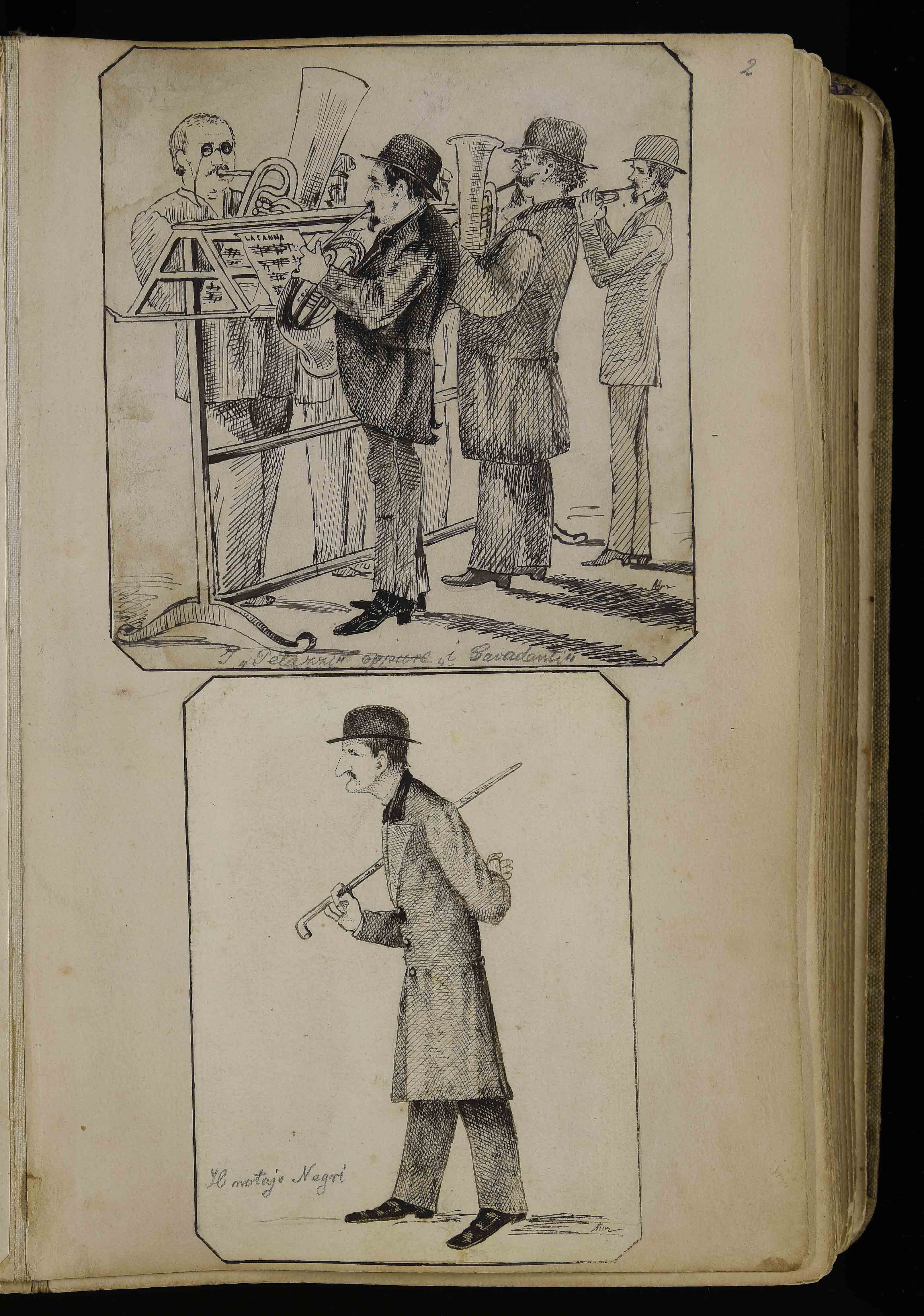 | Manoscritto cartaceo, 274x175 mm. In BCT1-3171, Albo di bozzetti caricature e disegni di vario genere di Giuseppe Mor, ca. 1885-1913, c. 2r |