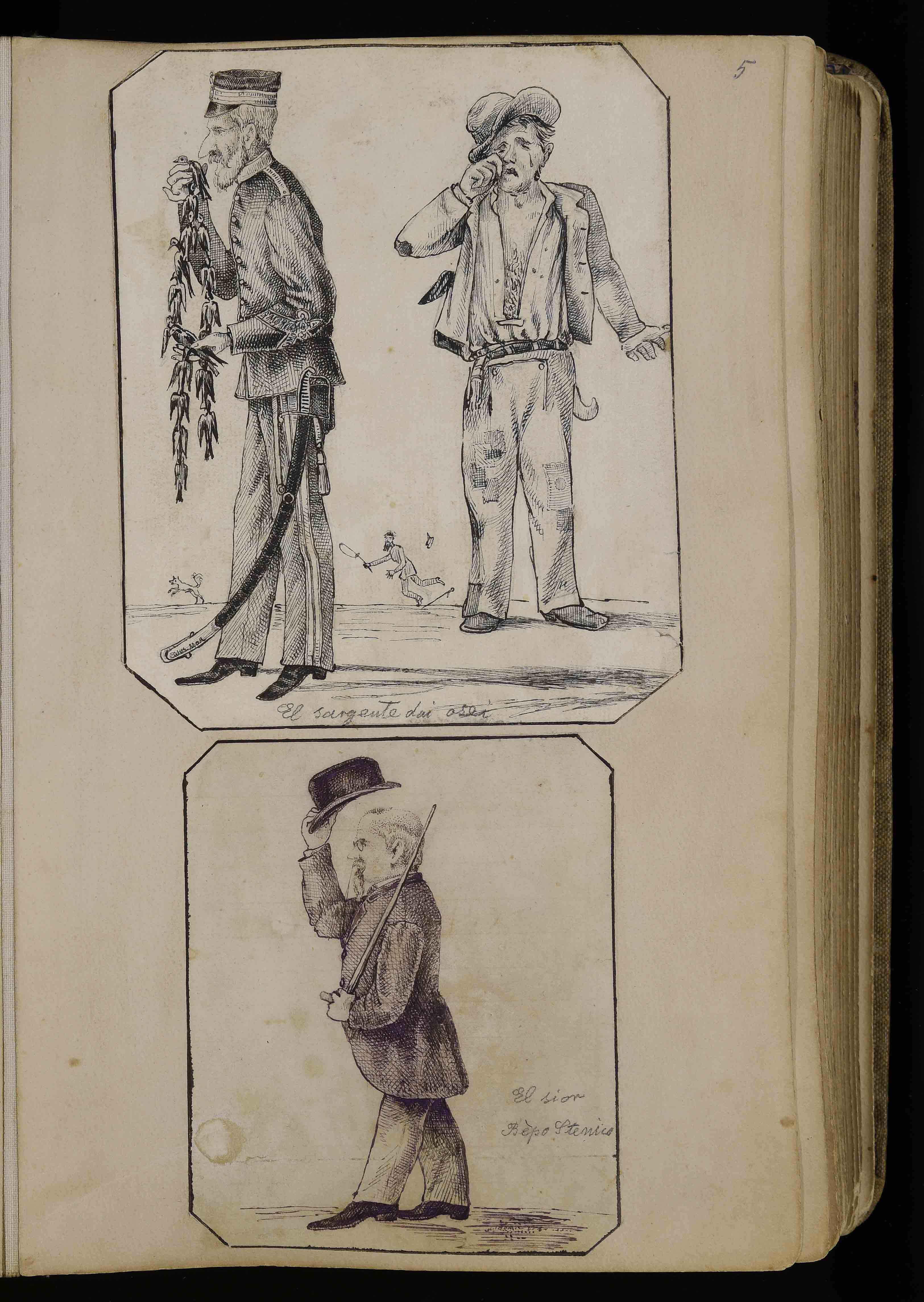 | Manoscritto cartaceo, 274x175 mm. In BCT1-3171, Albo di bozzetti caricature e disegni di vario genere di Giuseppe Mor, ca. 1885-1913, c. 5r |