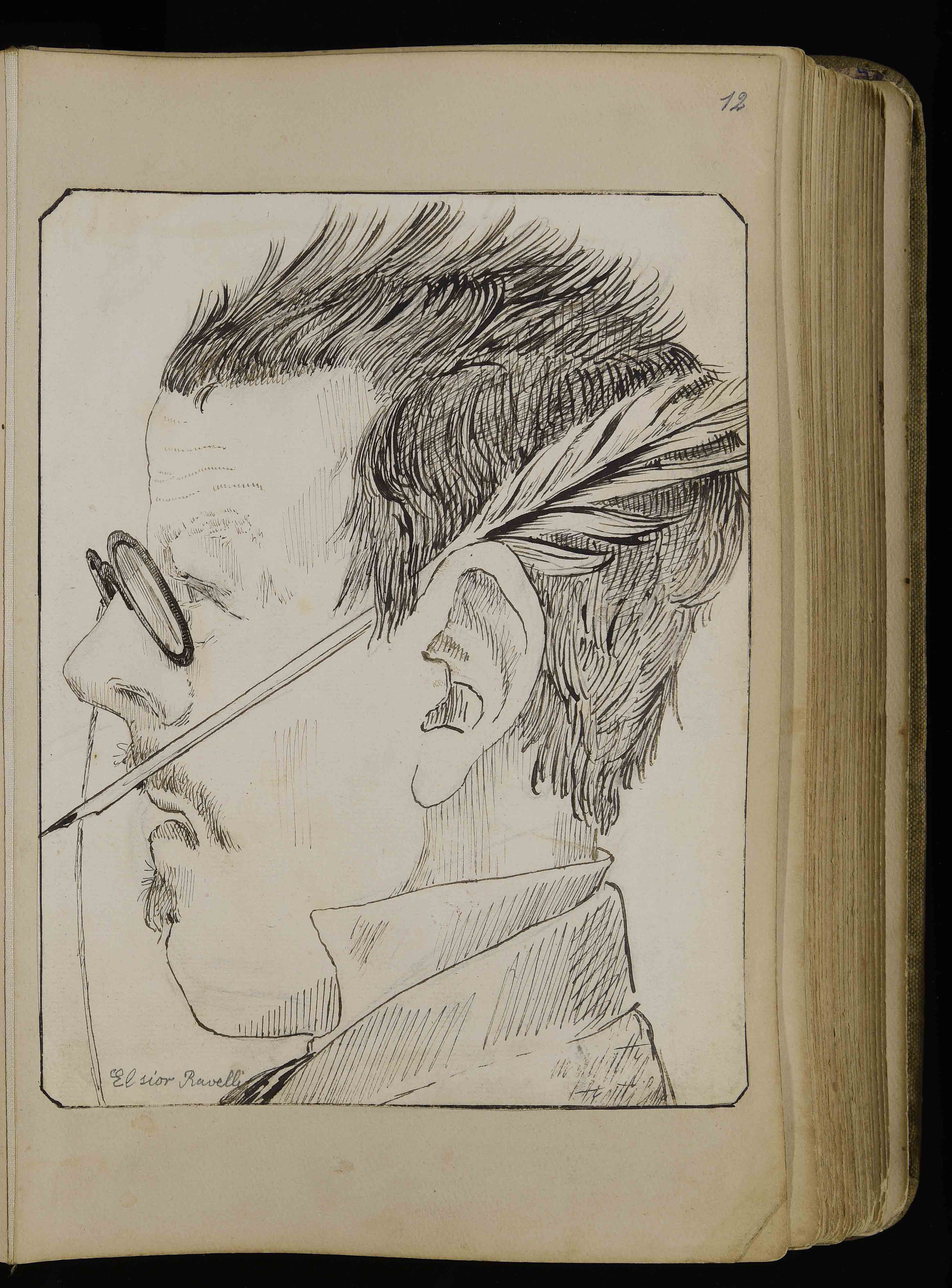 | Manoscritto cartaceo, 274x175 mm. In BCT1-3171, Albo di bozzetti caricature e disegni di vario genere di Giuseppe Mor, ca. 1885-1913, c. 12r |