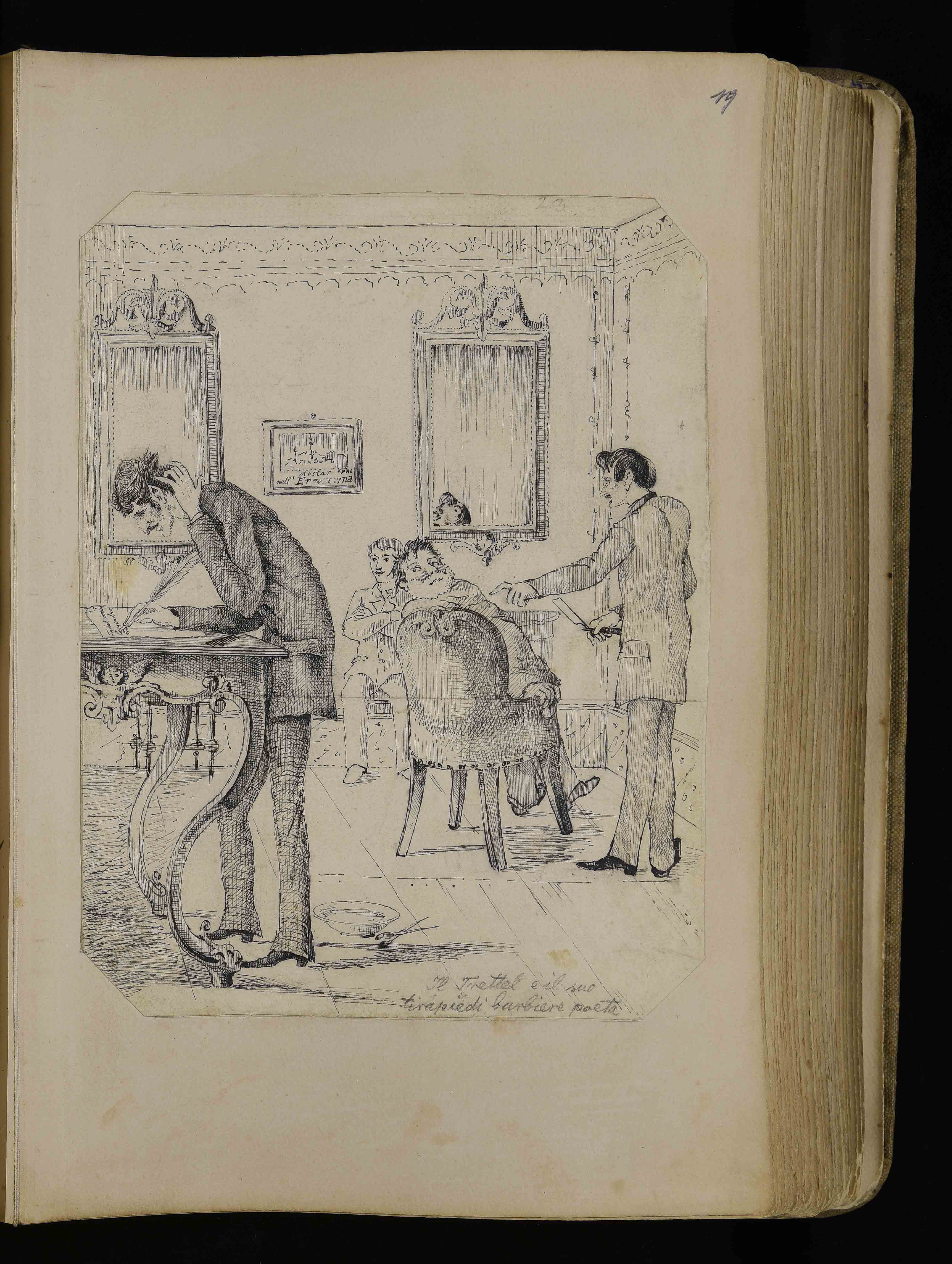 | Manoscritto cartaceo, 274x175 mm. In BCT1-3171, Albo di bozzetti caricature e disegni di vario genere di Giuseppe Mor, ca. 1885-1913, c. 19r |