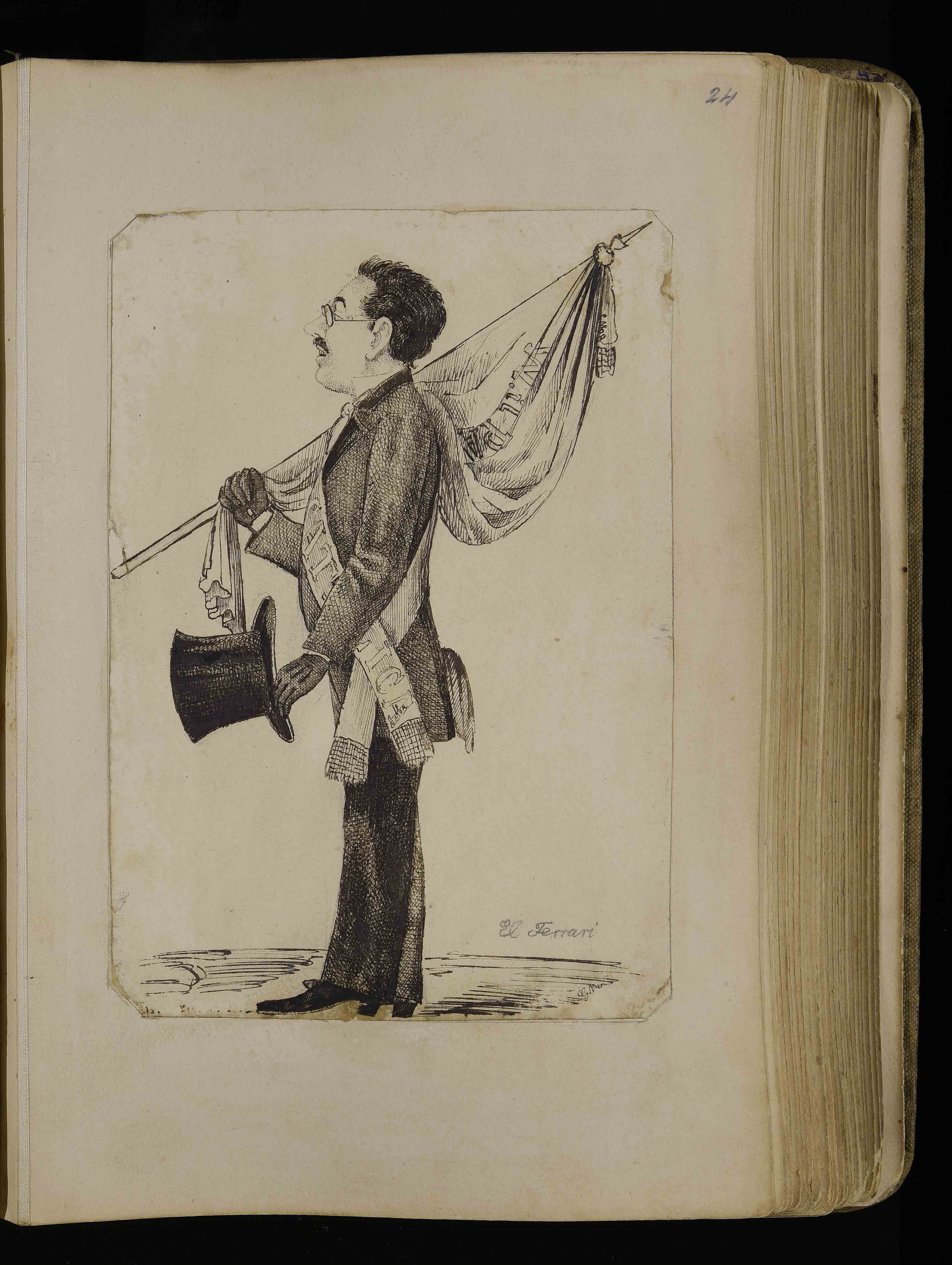 | Manoscritto cartaceo, 274x175 mm. In BCT1-3171, Albo di bozzetti caricature e disegni di vario genere di Giuseppe Mor, ca. 1885-1913, c. 24r |