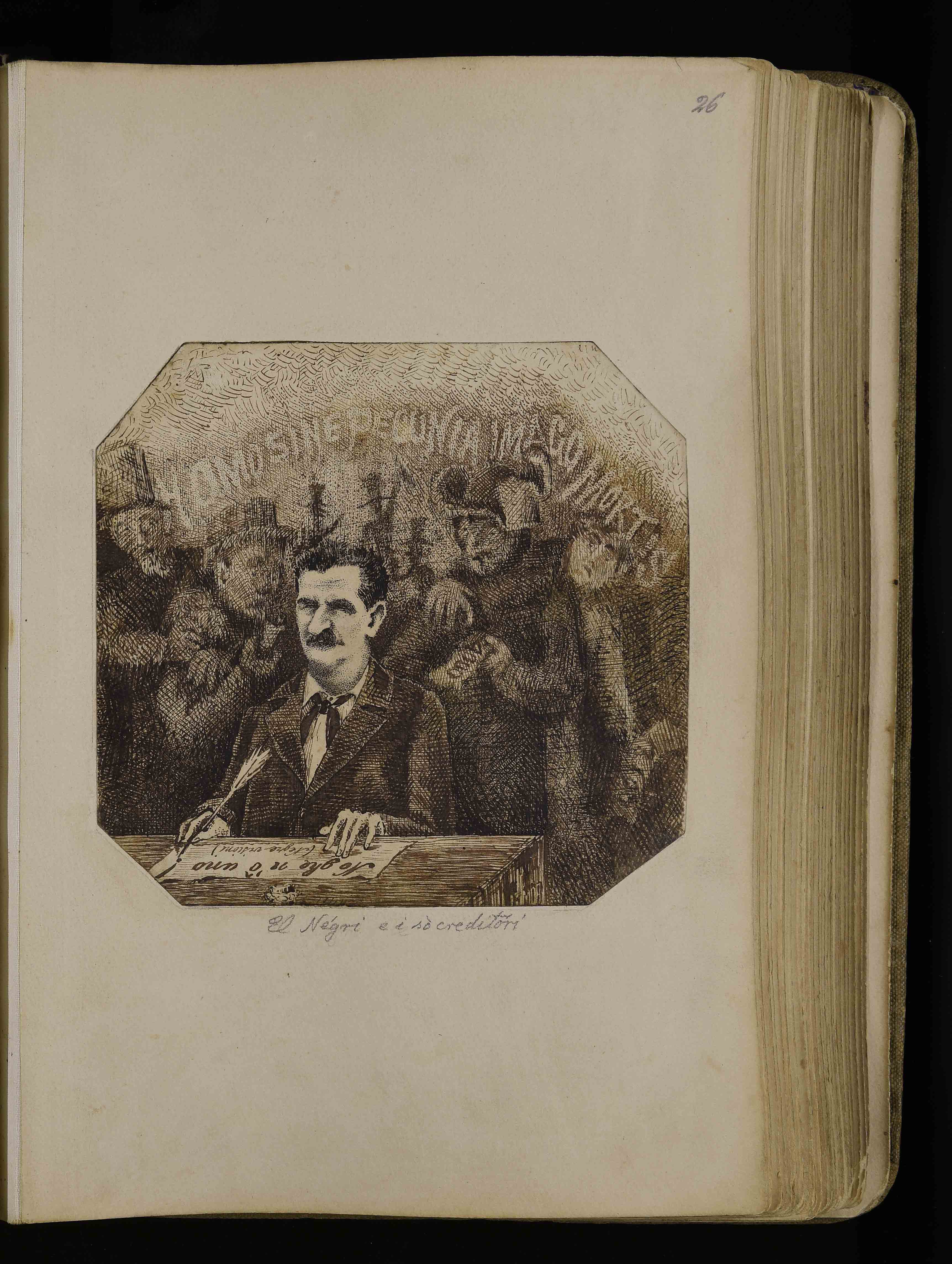 | Manoscritto cartaceo, 274x175 mm. In BCT1-3171, Albo di bozzetti caricature e disegni di vario genere di Giuseppe Mor, ca. 1885-1913, c. 26r |