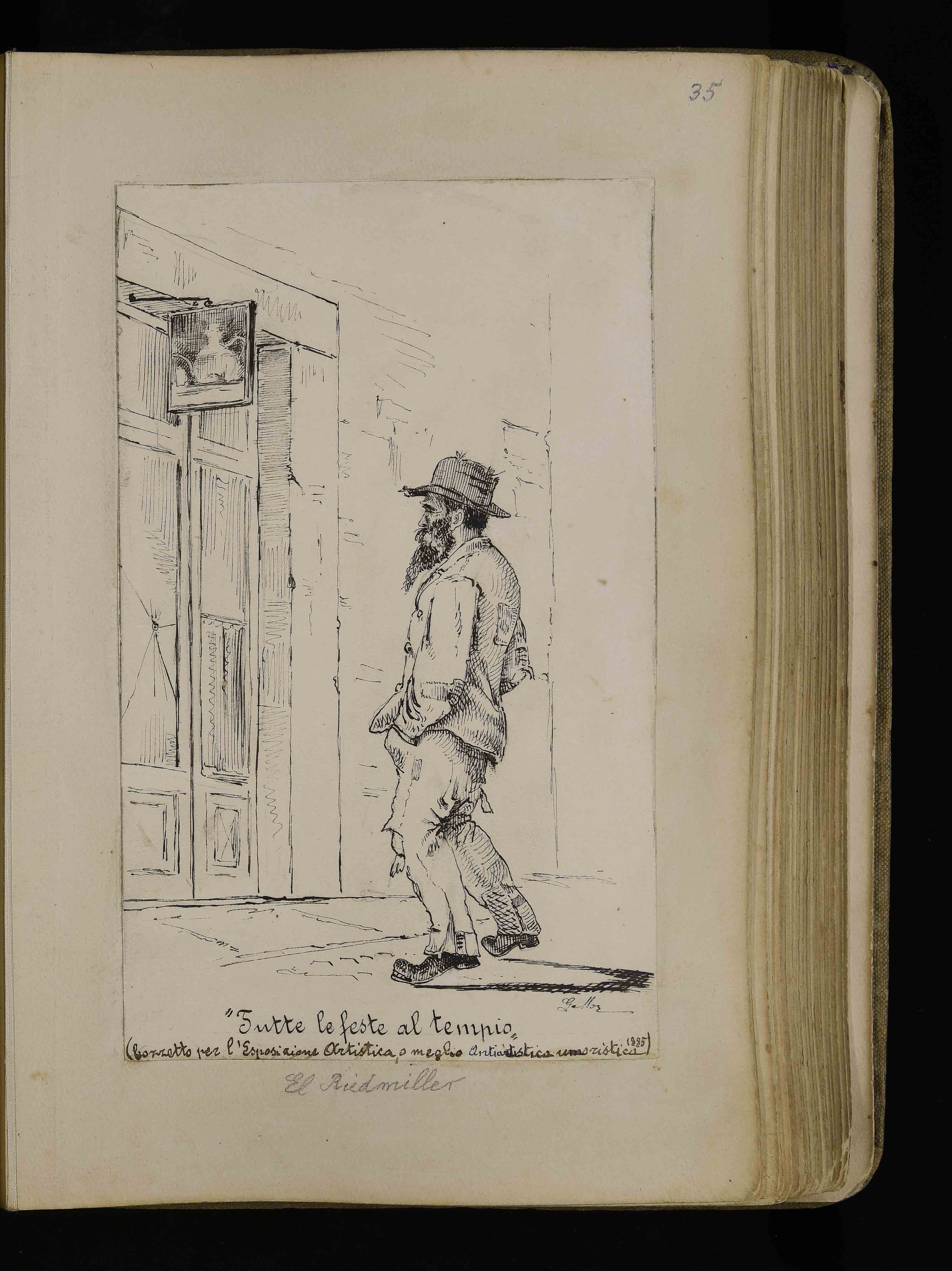 | Manoscritto cartaceo, 274x175 mm. In BCT1-3171, Albo di bozzetti caricature e disegni di vario genere di Giuseppe Mor, ca. 1885-1913, c. 35r |