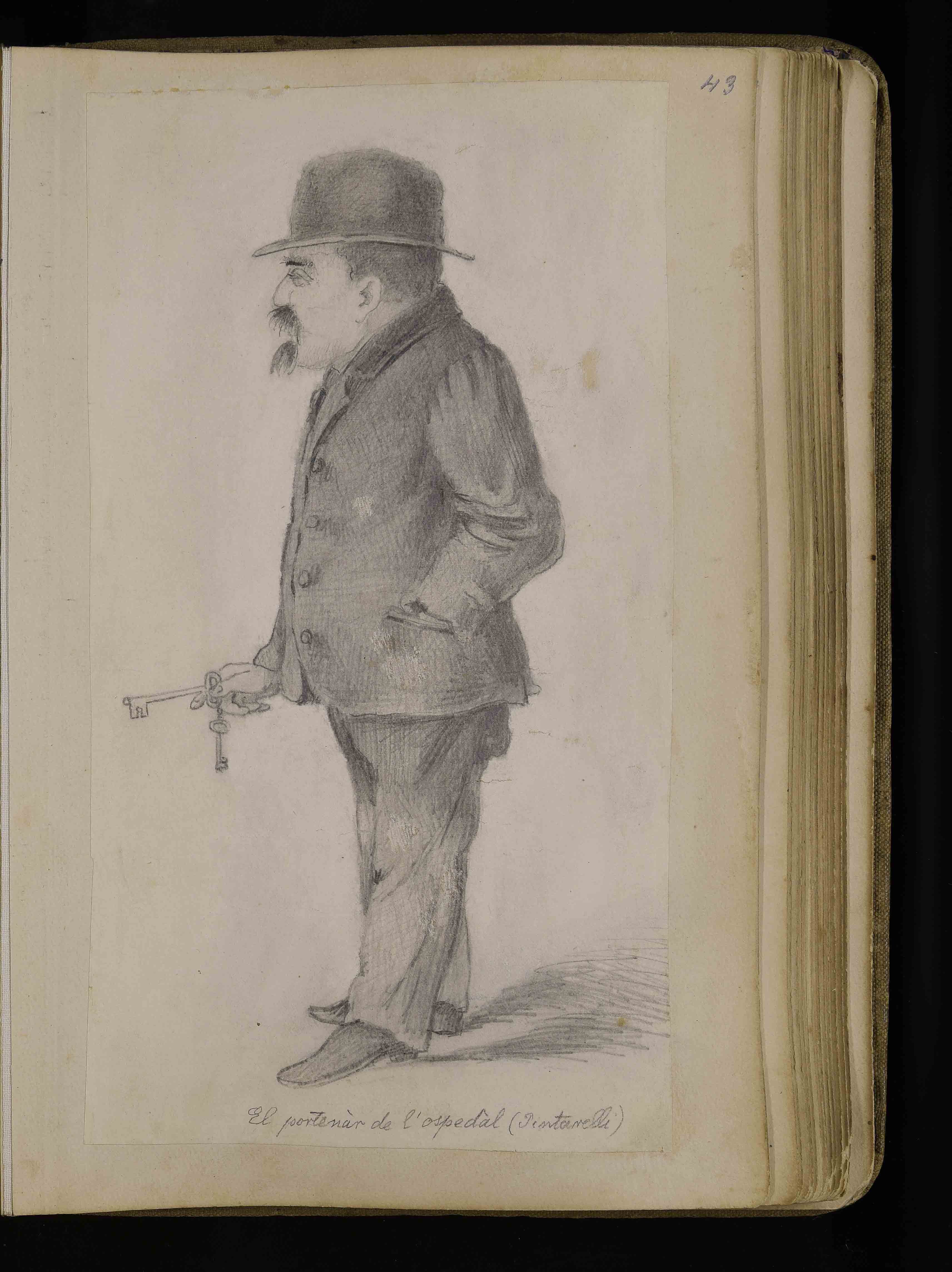 | Manoscritto cartaceo, 274x175 mm. In BCT1-3171, Albo di bozzetti caricature e disegni di vario genere di Giuseppe Mor, ca. 1885-1913, c. 43r |