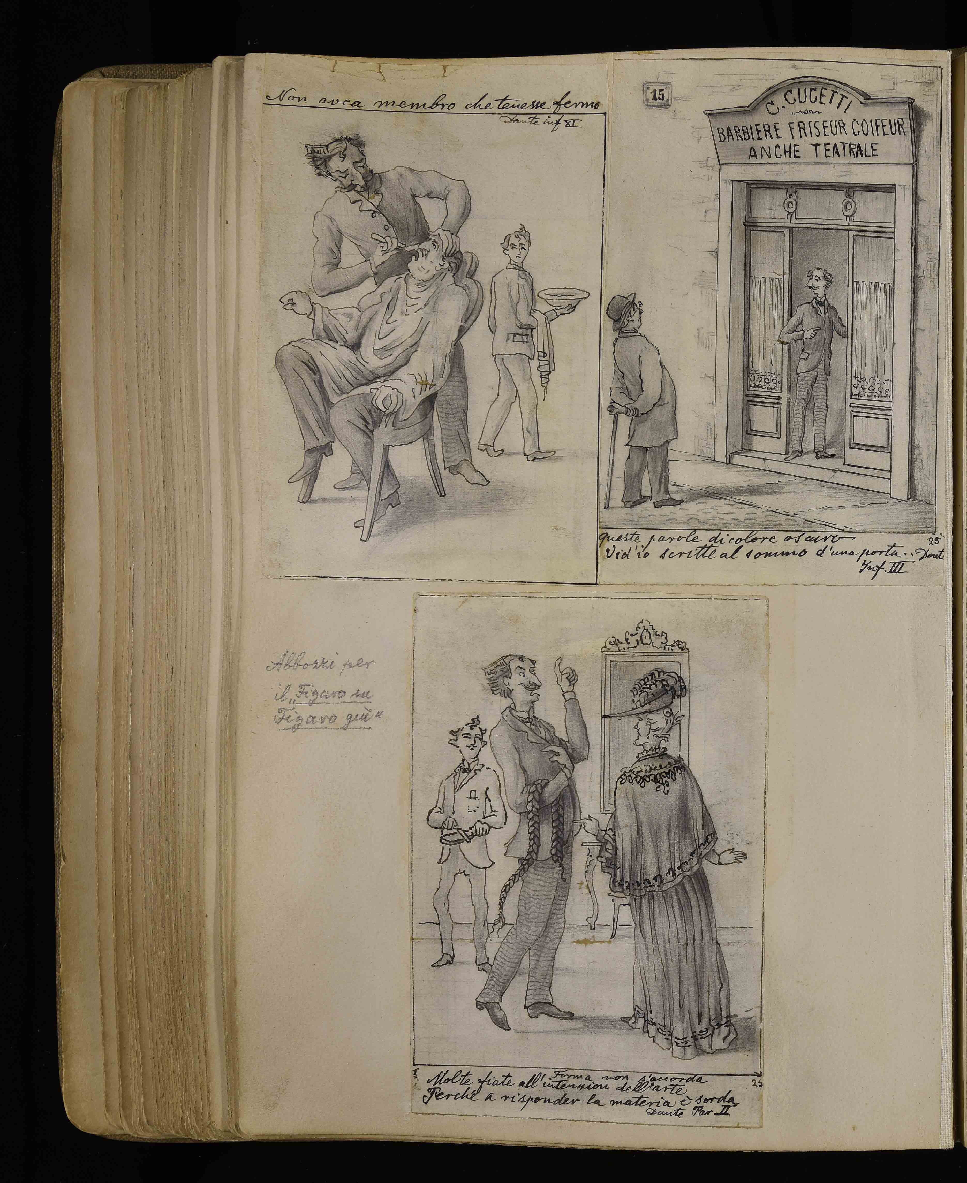 | Manoscritto cartaceo, 274x175 mm. In BCT1-3171, Albo di bozzetti caricature e disegni di vario genere di Giuseppe Mor, ca. 1885-1913, c. 49v |