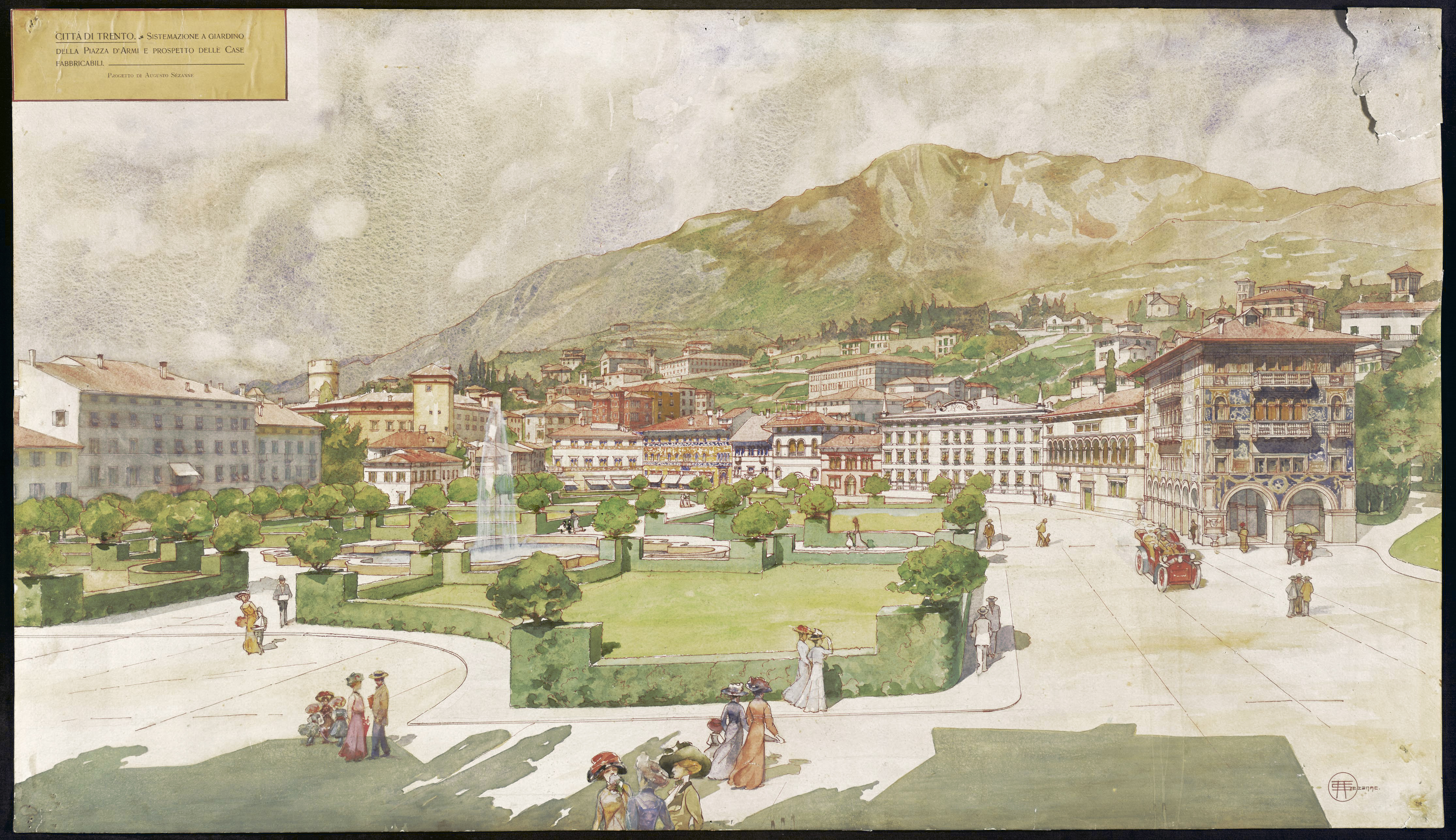 50x91 cm; acquerello. La datazione del dipinto si colloca nell’arco cronologico 1880-1935 in cui l’autore fu attivo in Trentino come architetto e decoratore. Il dipinto fu verosimilmente realizzato dopo il 1910, anno in cui il Comune di Trento decise la trasformazione della Piazza d’armi in una piazza ad uso cittadino, come si legge nell'articolo del Trentino del 18 luglio 2014
