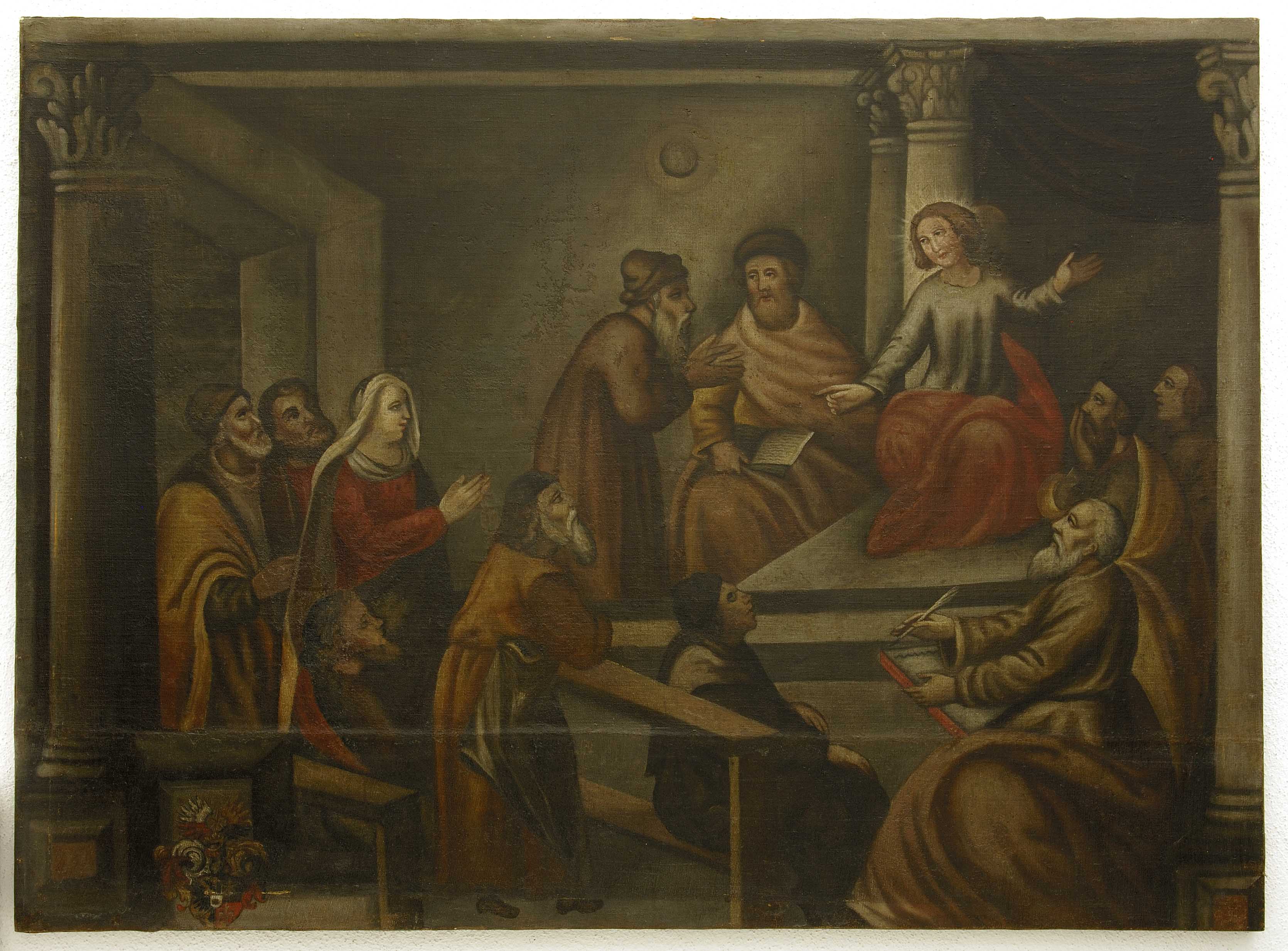 99,5x135,5 cm; olio su tela. Sul retro della cornice etichetta con indicazione di possesso attribuito alla famiglia Ricci di Neun e Castel Corona, di cui è visibile lo stemma sul dipinto (cfr. Tabarelli de Fatis - Borrelli 2004,pp. 239-240 ). Sul retro della tela è presente una nota manoscritta che indica la donazione da parte della Famiglia Ricci all’Oratorio di San Filippo: “Questa effigie è stata donata all’oratorio de S. Filippo delle signore gentidone di Trento. Anno 1730, li 4 giuno”. La datazione si ricava dall’anno di donazione del dipinto: ante 1730