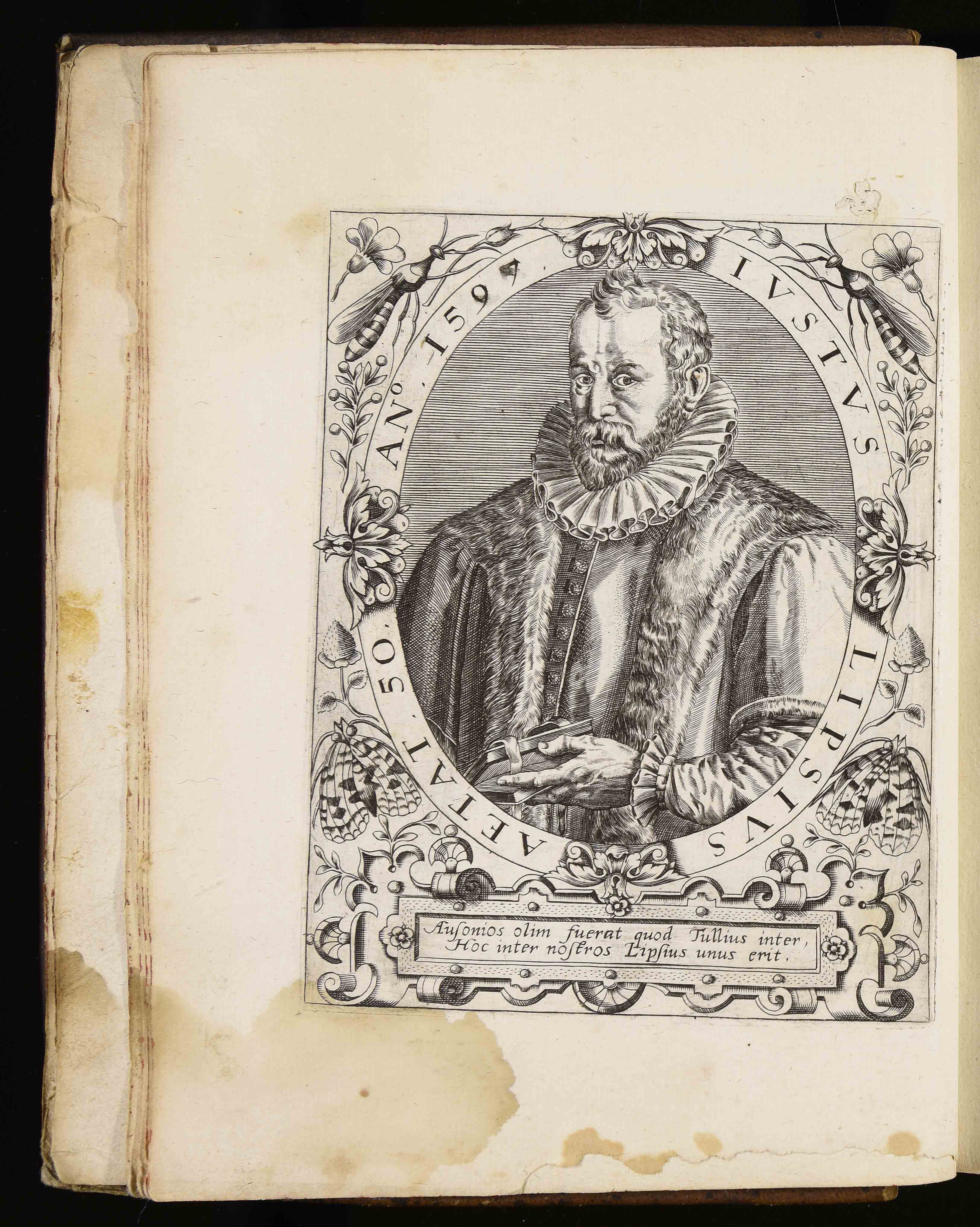 | Iustus Lipsius aetat. 50. an. 1597. Ausonios olim fuerat quod Tullius inter hoc inter nostros Lipsius unus erit |