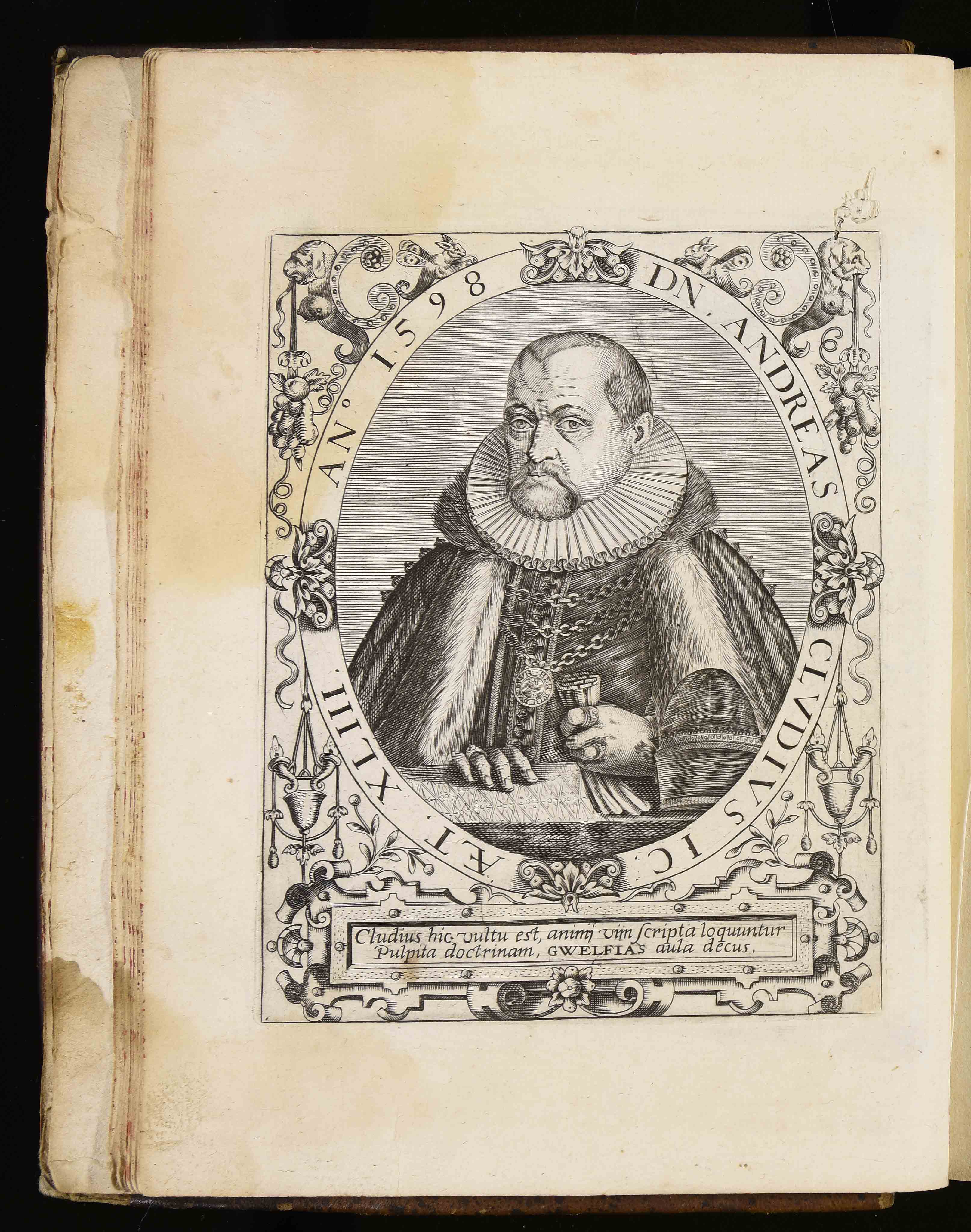 | Dn. Andreas Cludius ic. aet. XLIII. an. 1598. Cludius hic vultu est animi vim scripta loquuntur pulpita doctrinam Gwelfias aula decus |