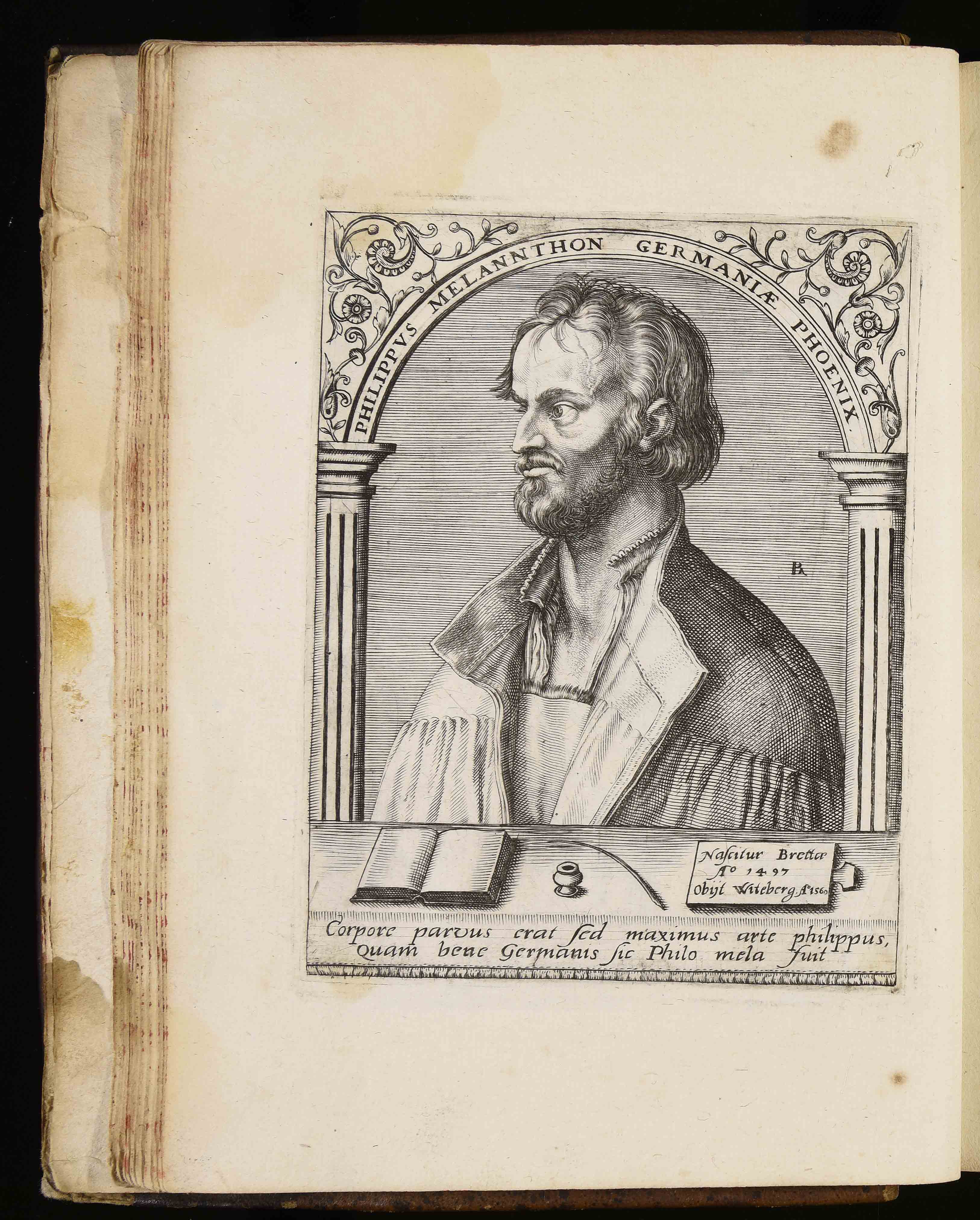 | Philippus Melannthon Germaniae phoenix. Nascitur Brettae anno 1497. Obijt Witeberg anno 1560. Corpore parvus erat sed maximus arte philippus quam bene Germanis sic Philo mela fuit |