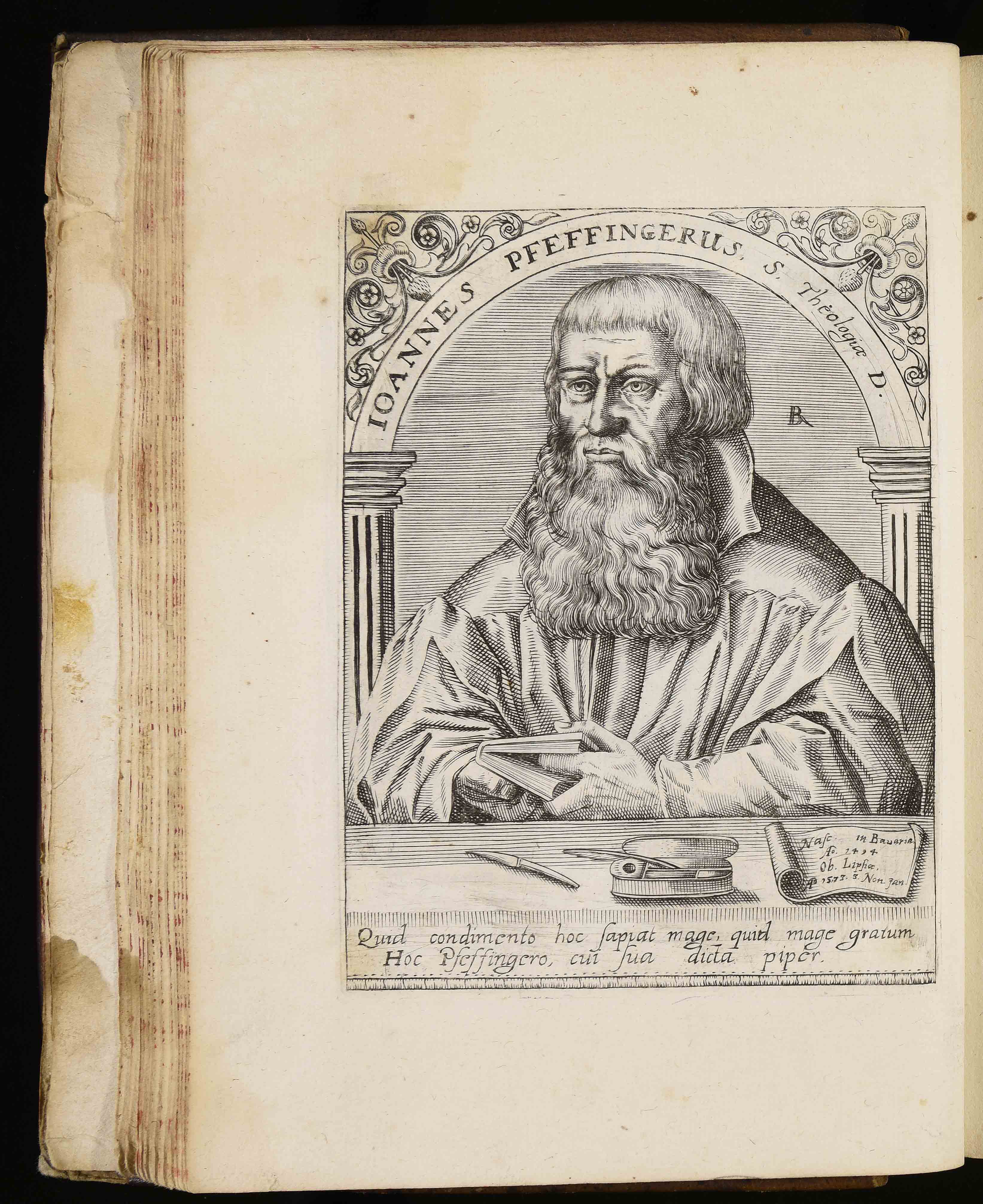 | Ioannes Pfeffingerius s. theologiae d. Nascitur in Bavaria anno 1494. Ob. Lipsia anno 1573. 3. Non. Jan. Quid condimento hoc sapiat mage quid mage gratum hoc Pfeffingerio cui sua dicta piper |