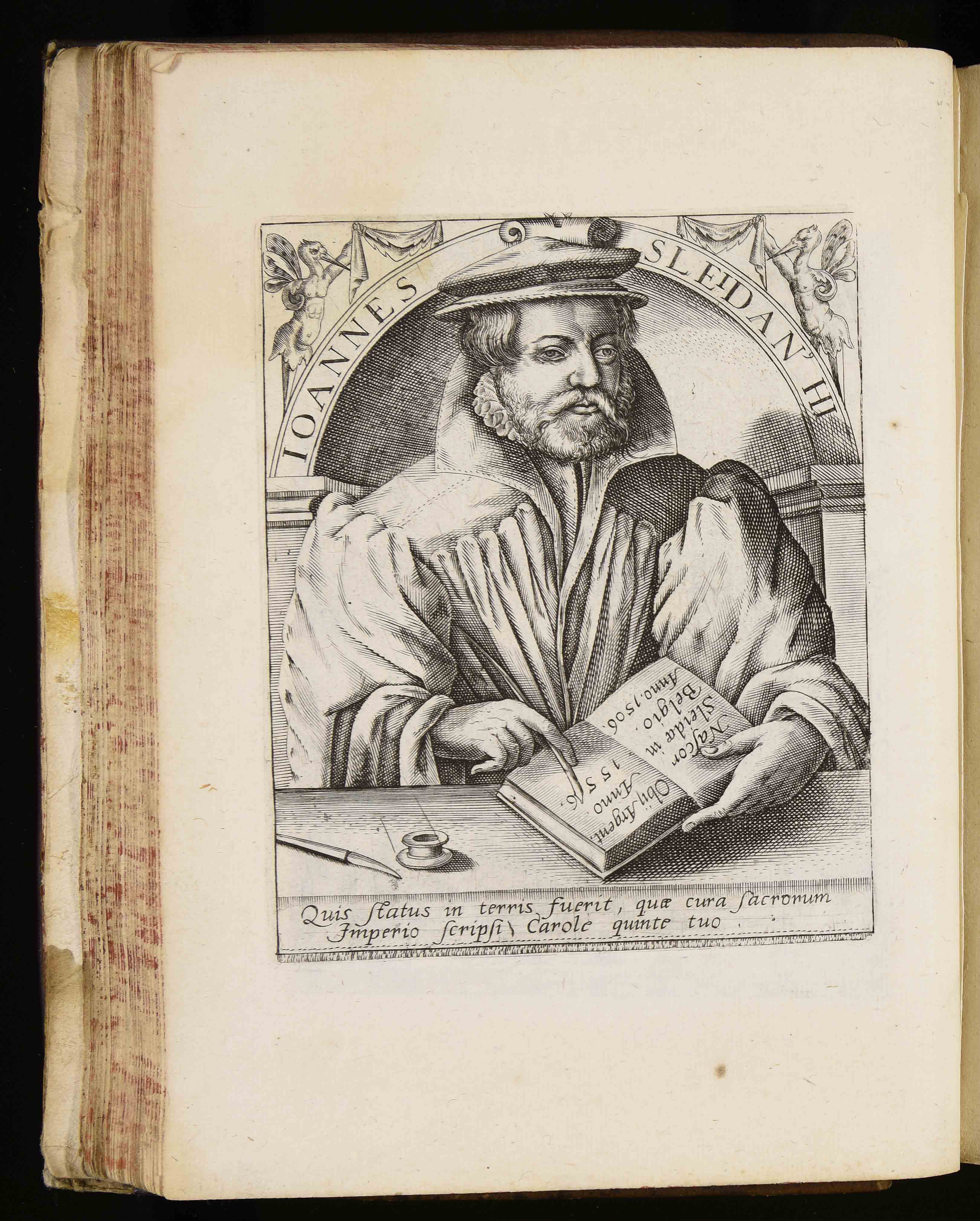 | Ioannes Sleidanus hi. Nascor Sleidae in Belgio anno 1506. Obij Argent. anno 1556. Quis status in terris fuerit quae cura sacrorum imperio scripsi Carole quinte tuo |