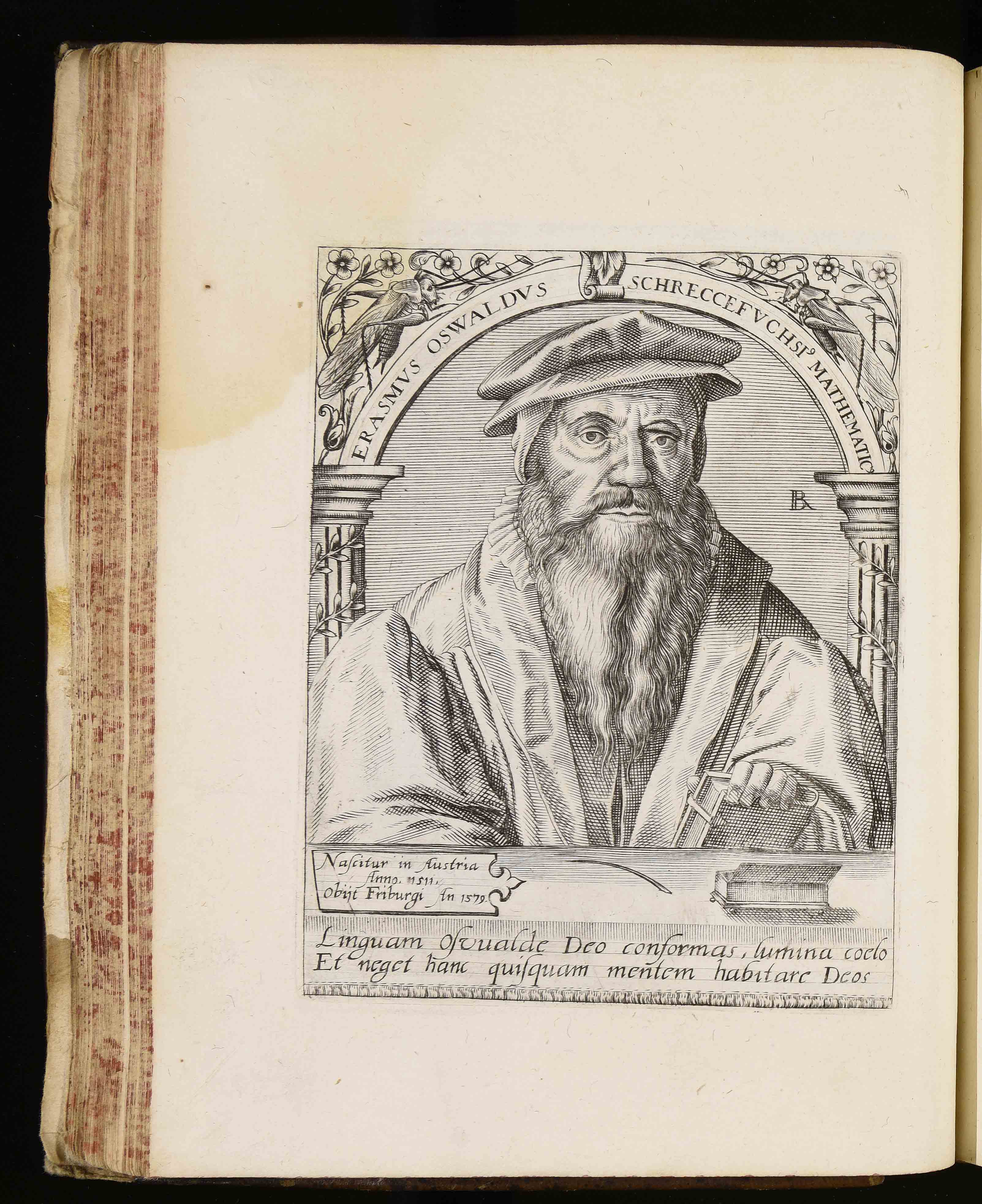 | Erasmus Oswaldus Schreccefuchsius mathematicus. Nascitur in Austria anno. 1511. Obijt Friburgi an 1579. Linguam Osvalde Deo conformas lumina coelo et negat hanc quisquam mentem habitare Deos |