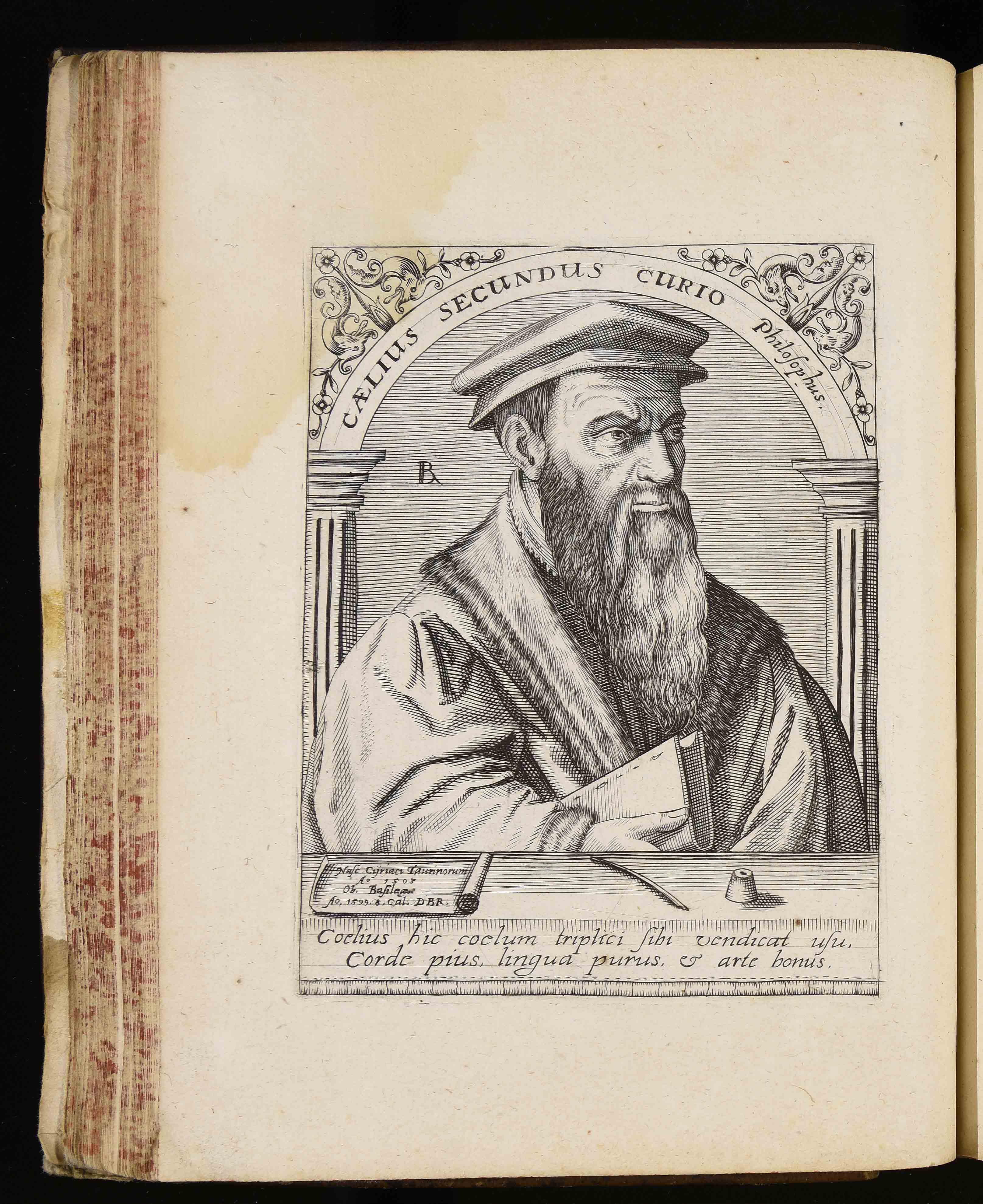 | Caelius Secundus Curio philosophus. Nascitur Cijriaci Taurinorum anno 1503. Ob. Basilea anno 1599. 8. Cal. DBR. Coelius hic coelum triplici sibi vendicat usu corde pius lingua purus et arte bonus |