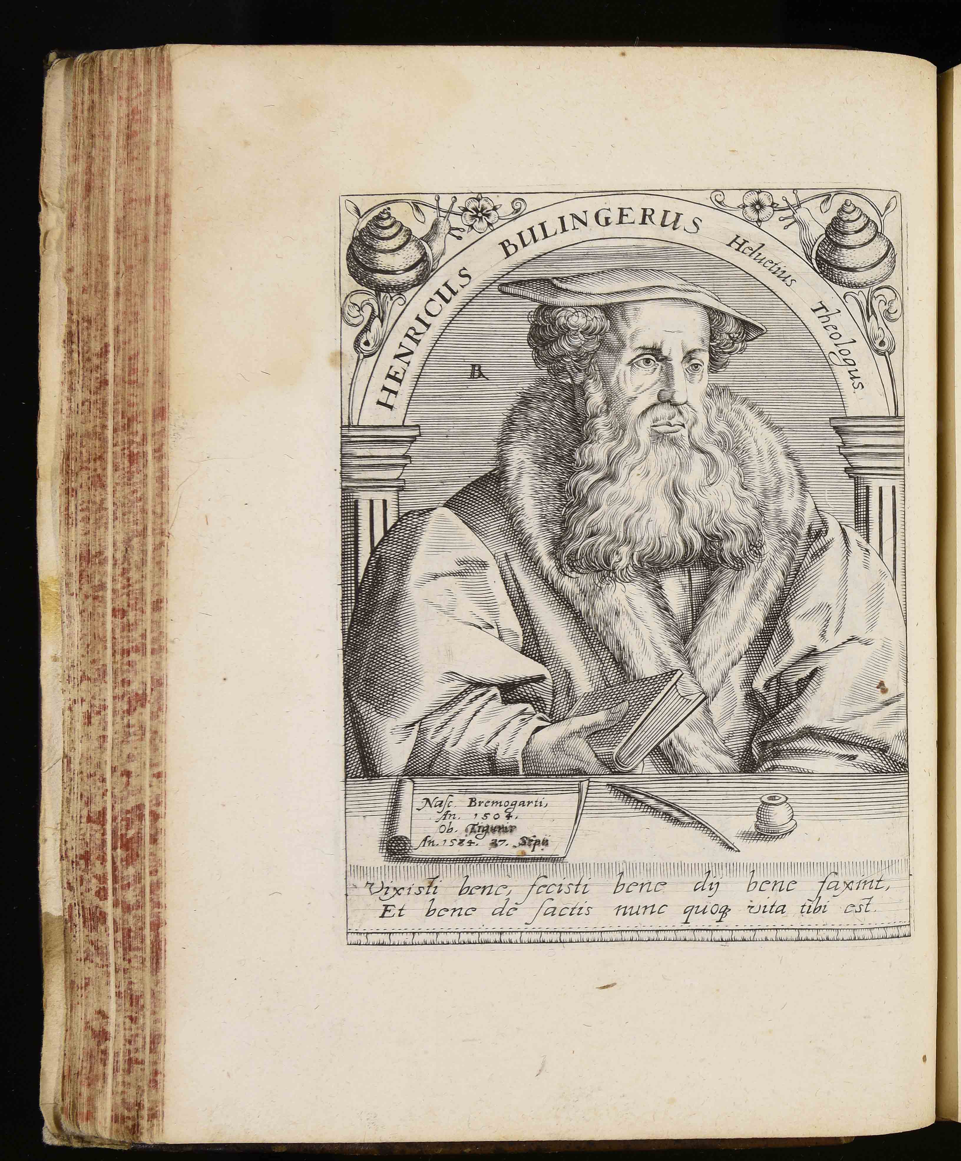 | Henricus Bulingerus Helveticus theologus. Nasc. Bremogarti anno 1504. Ob. Tiguri anno 1574. 27. Septi. Vixisti bene fecisti bene dii bene faxint et bene de factis nunc quoque vita tibi est |