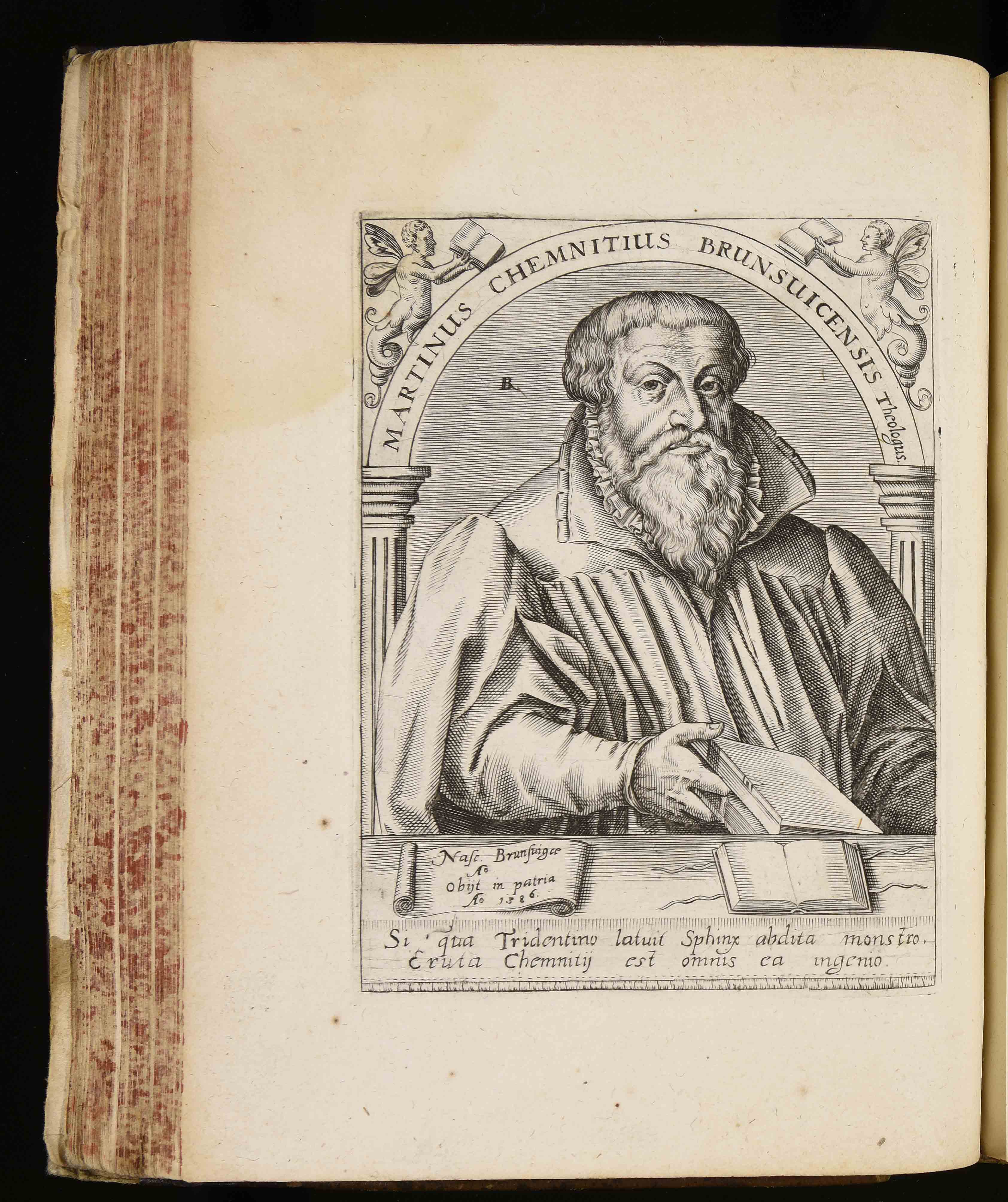 | Martinus Chemnitius Brunsuicensis theologus. Nasc. Brunsuigae anno. Obijt in patria anno 1586. Si qua Tridentino latuit Sphinx abdita monstro eruta Chemnitij est omnis ea ingenio |
