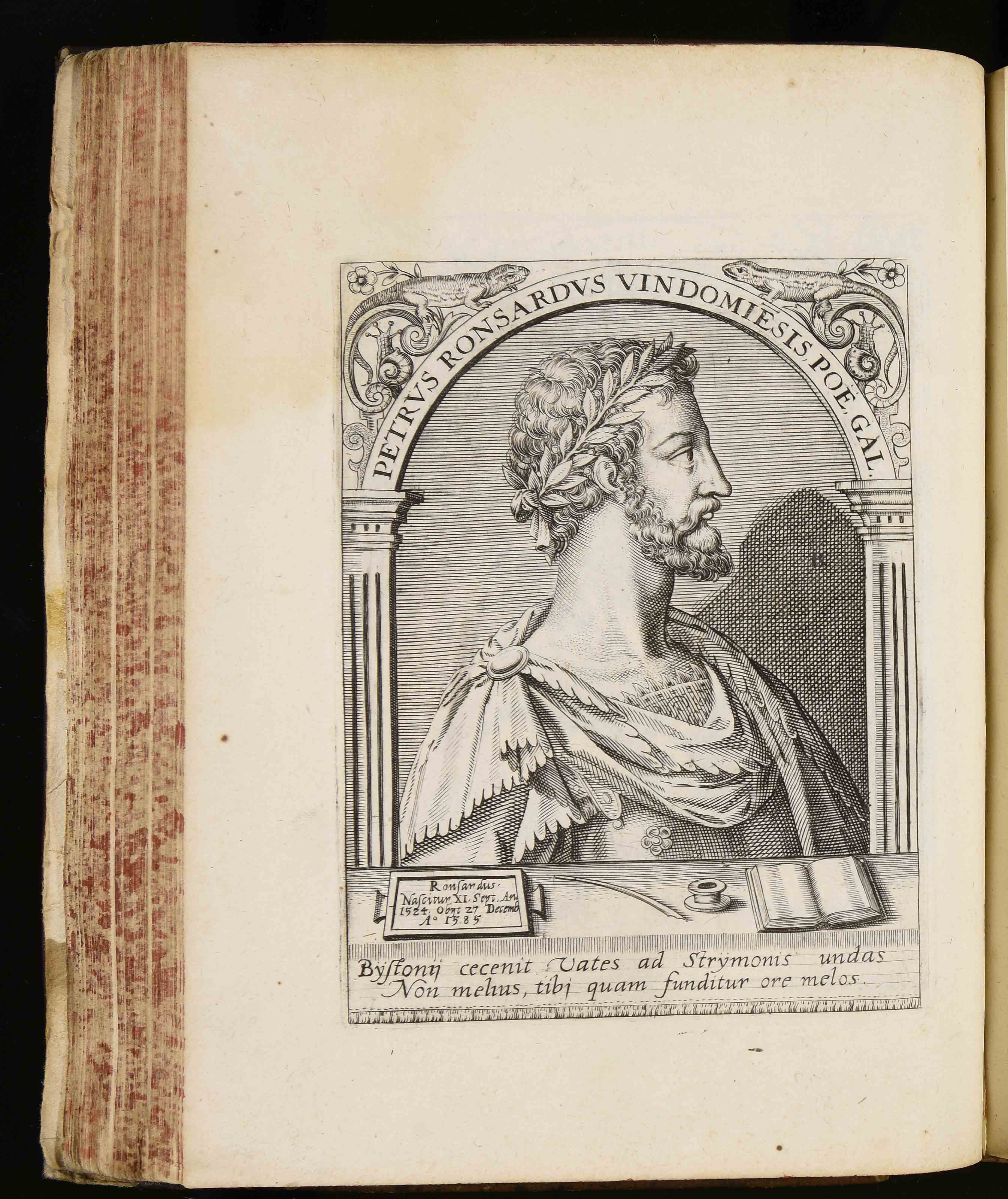 | Petrus Ronsardus Vindomiensis poe. Gal. Ronsardus. Nascitur XI Sept. an. 1524. Obyt 27 Decemb. anno 1585. Bystonij cecenit vates ad Strymonis undas non melius tibi quam funditur ore melos |