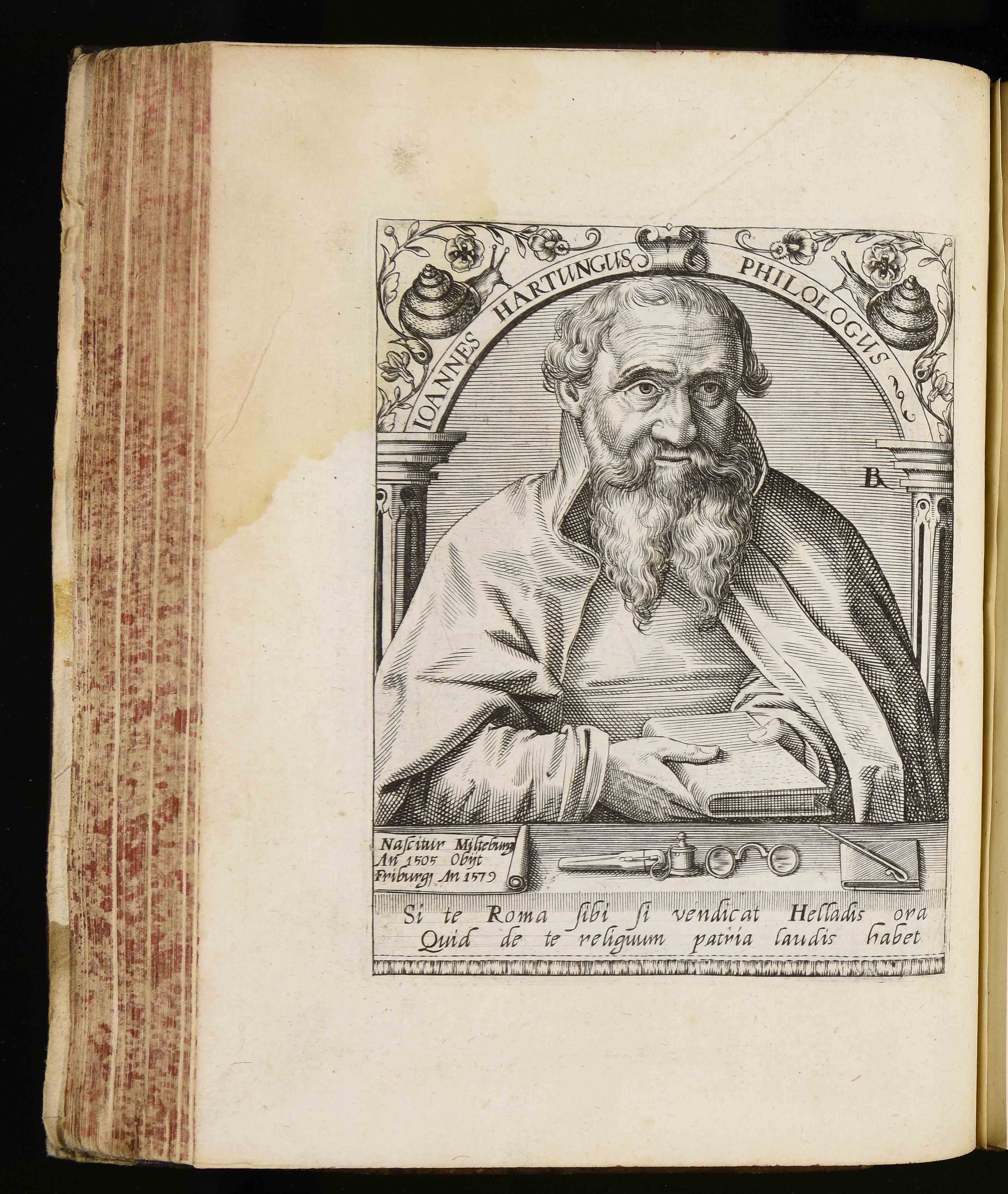 | Ioannes Hartungus philologus. Nascitur Milteburg an. 1505. Obijt Friburgi an. 1579. Si te Roma sibi si vendicat Helladis ora quid de te religium paria laudis habet |