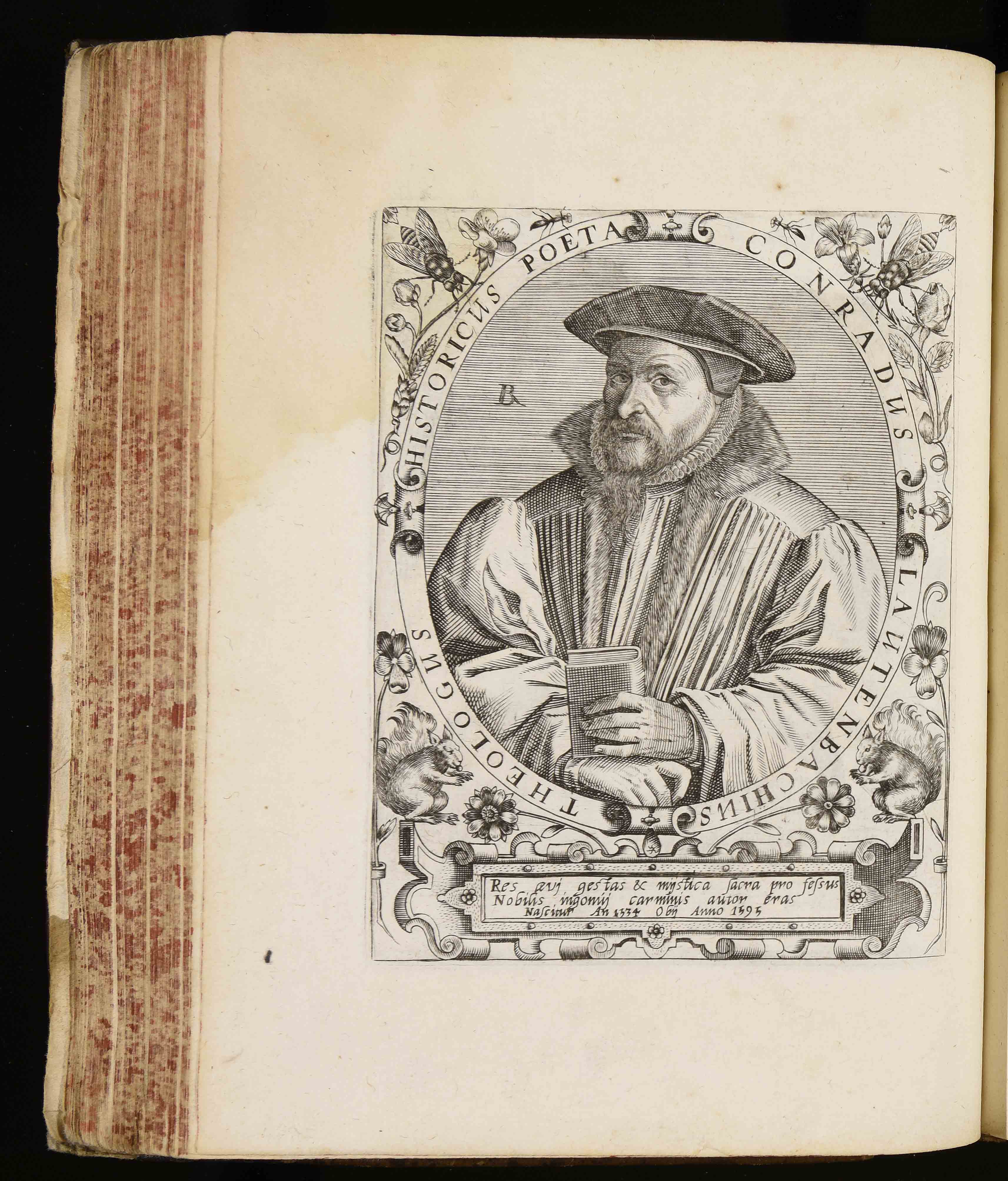 | Conradus Lautenbachius theologus historicus poeta. Res avi gestas et mystica sacra pro fessus nobilis (ingonivi) carminis autor eras. Nascitur an. 1534 Obii anno 1595 |