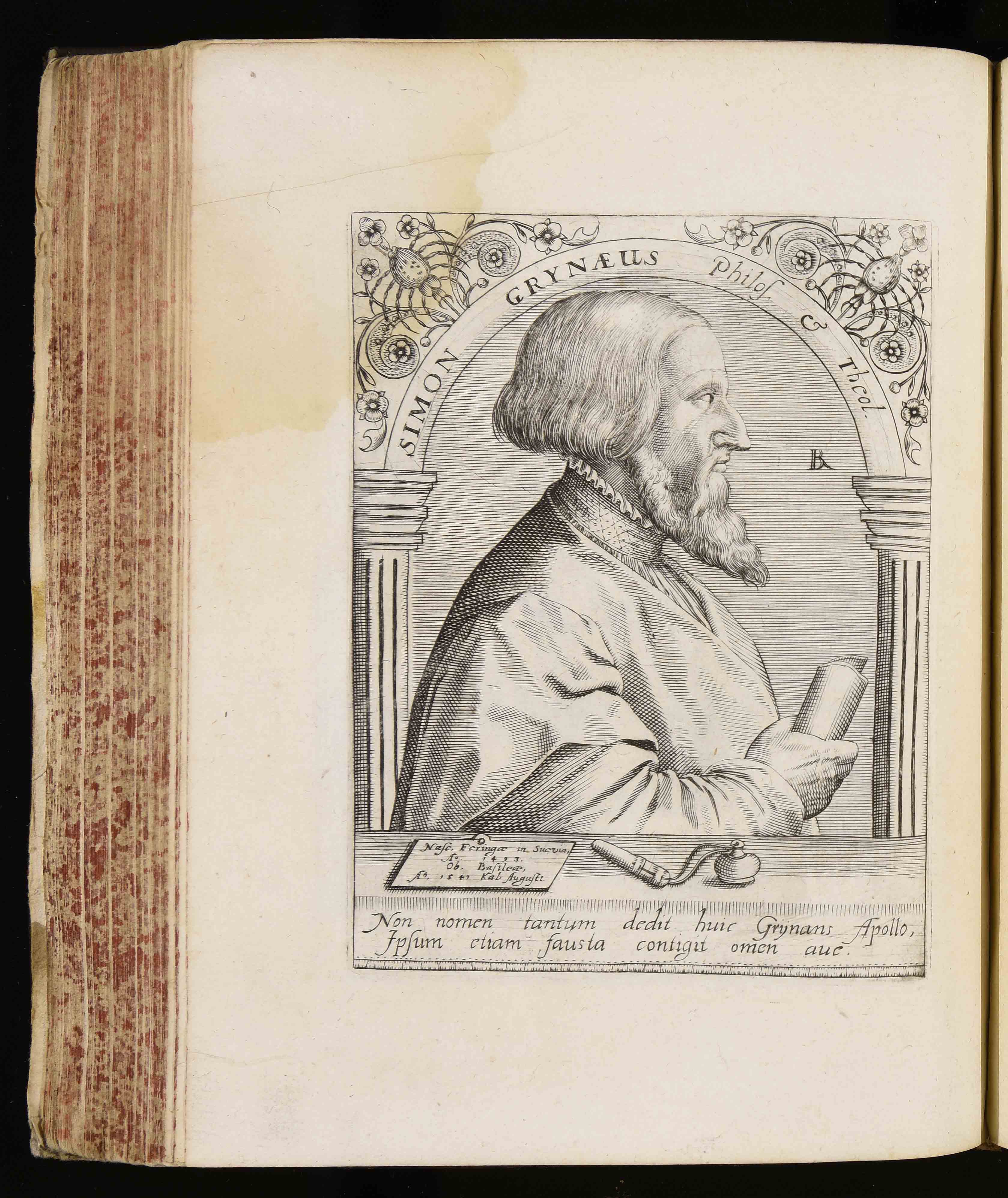 | Simon Grynaeus philos. et theol. Nasc. Feringae in Svevia anno 1493. Ob. Basileae anno 1541 Kal. Augusti. Non nomen tantum dedit huic Grijnans Apollo ipsum etiam fausta contigit omen ave |
