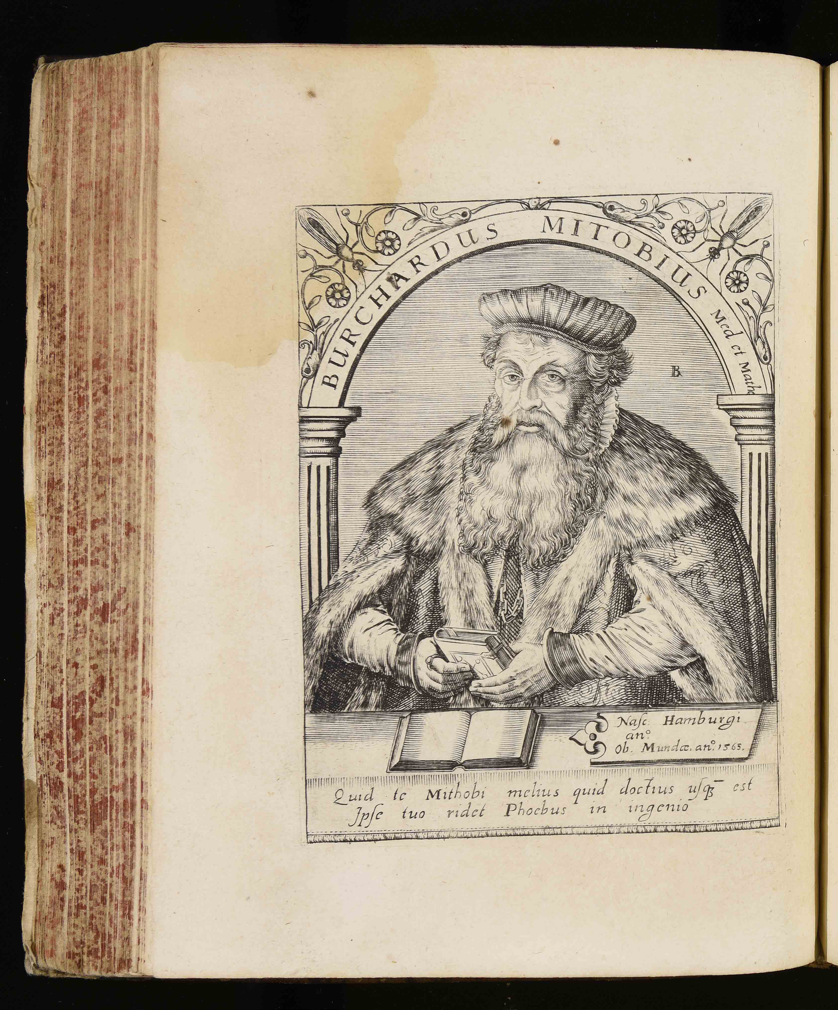 | Burchardus Mitobius med et mathe. Nasc. Hamburgi anno. Ob. Mundae anno 1565. Quid te Mithobi melius quid doctius usque est ipse tuo ridet Phoebus in ingenio |