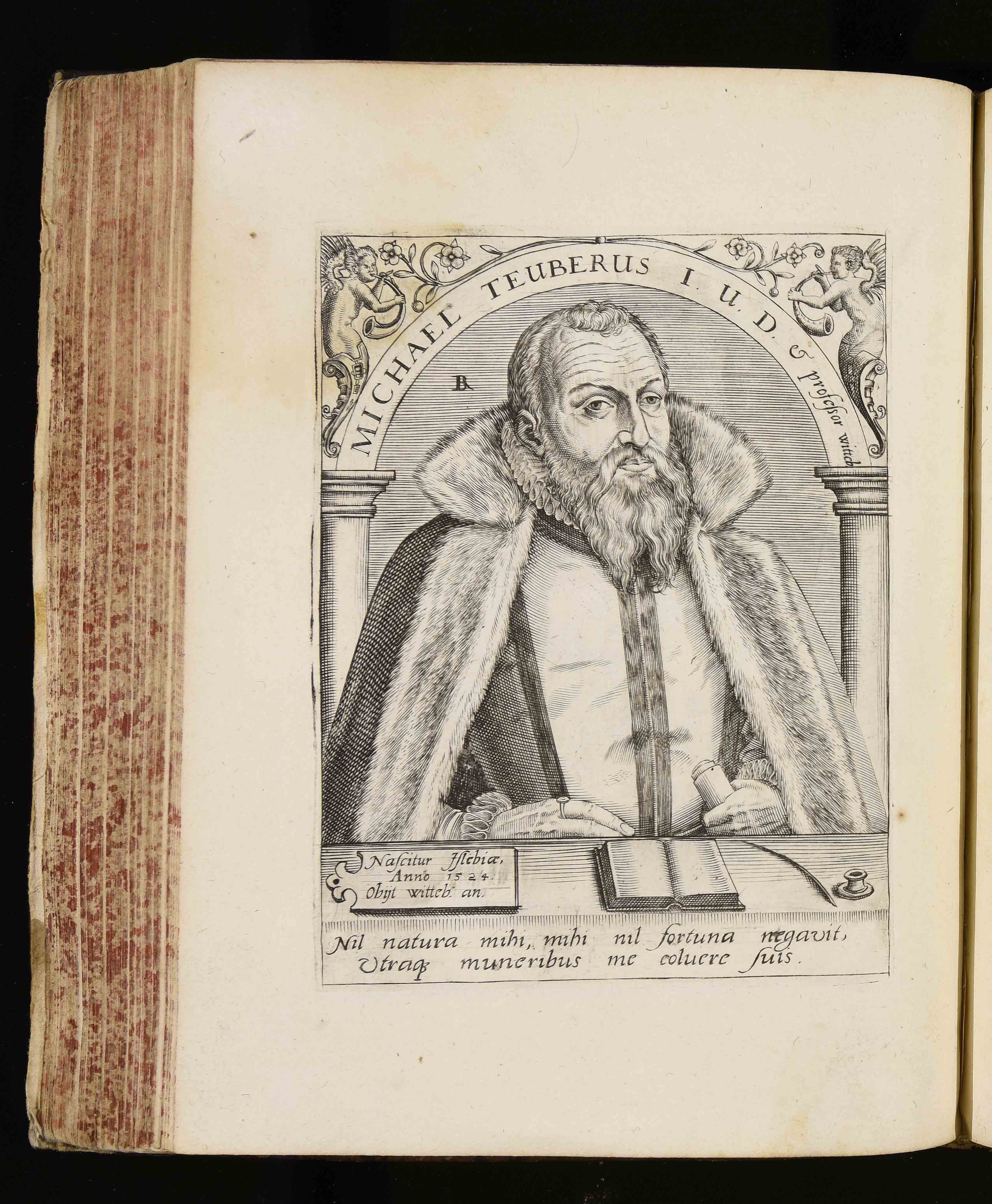 | Michael Teuberus I. U. D. et professor Witteb. Nascitur Islebiae anno 1524. Obijt Witteb. an. Nil natura mihi mihi nil fortuna negavit utraque muneribus me coluere suis |
