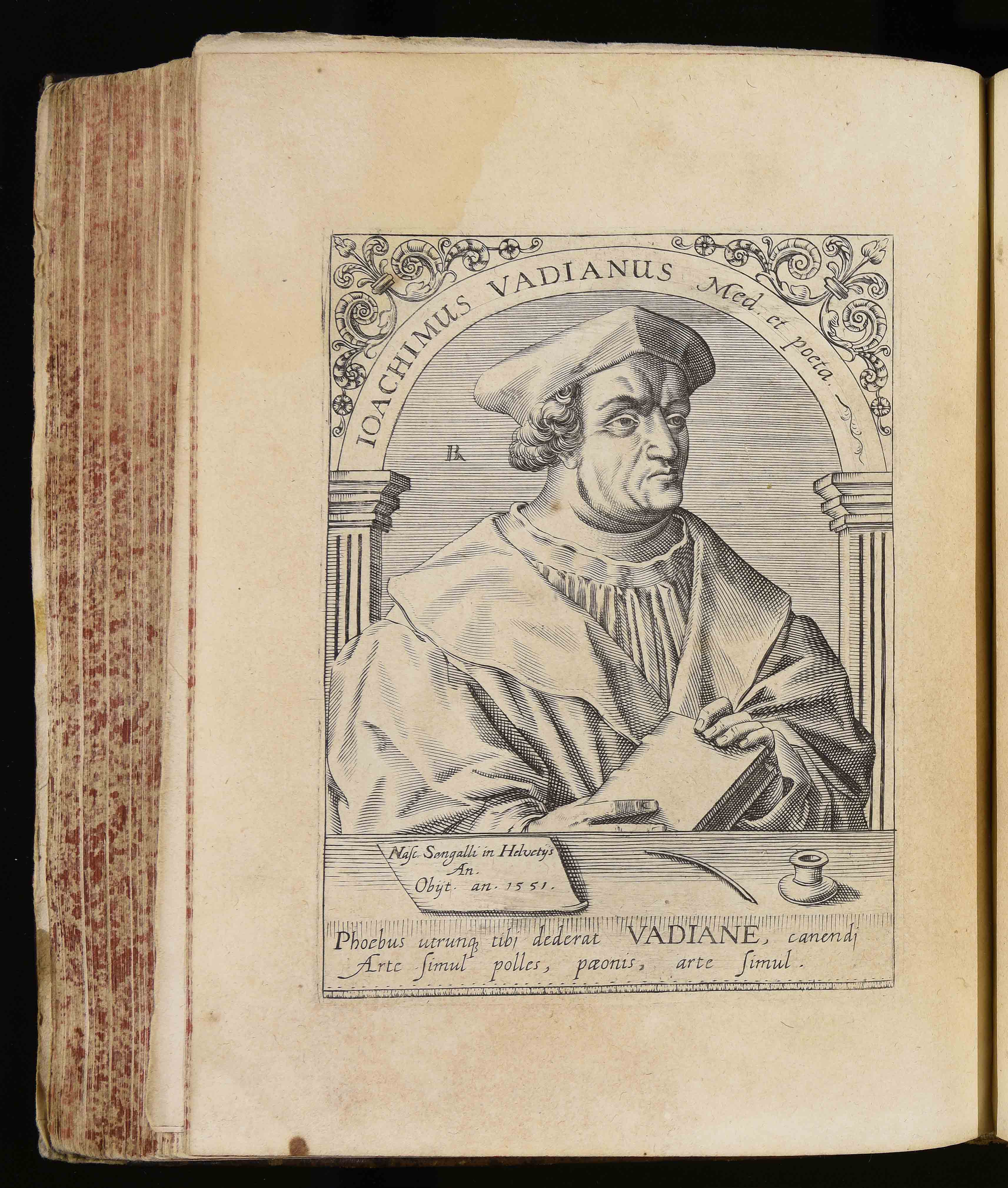 | Ioachimus Vadianus med. et poeta. Nasc. Sangalli in Helvetijs an. Obijt an. 1551. Phoebus utrunque tibi dederat Vadiane canendi arte simul polles paeonis arte simul |