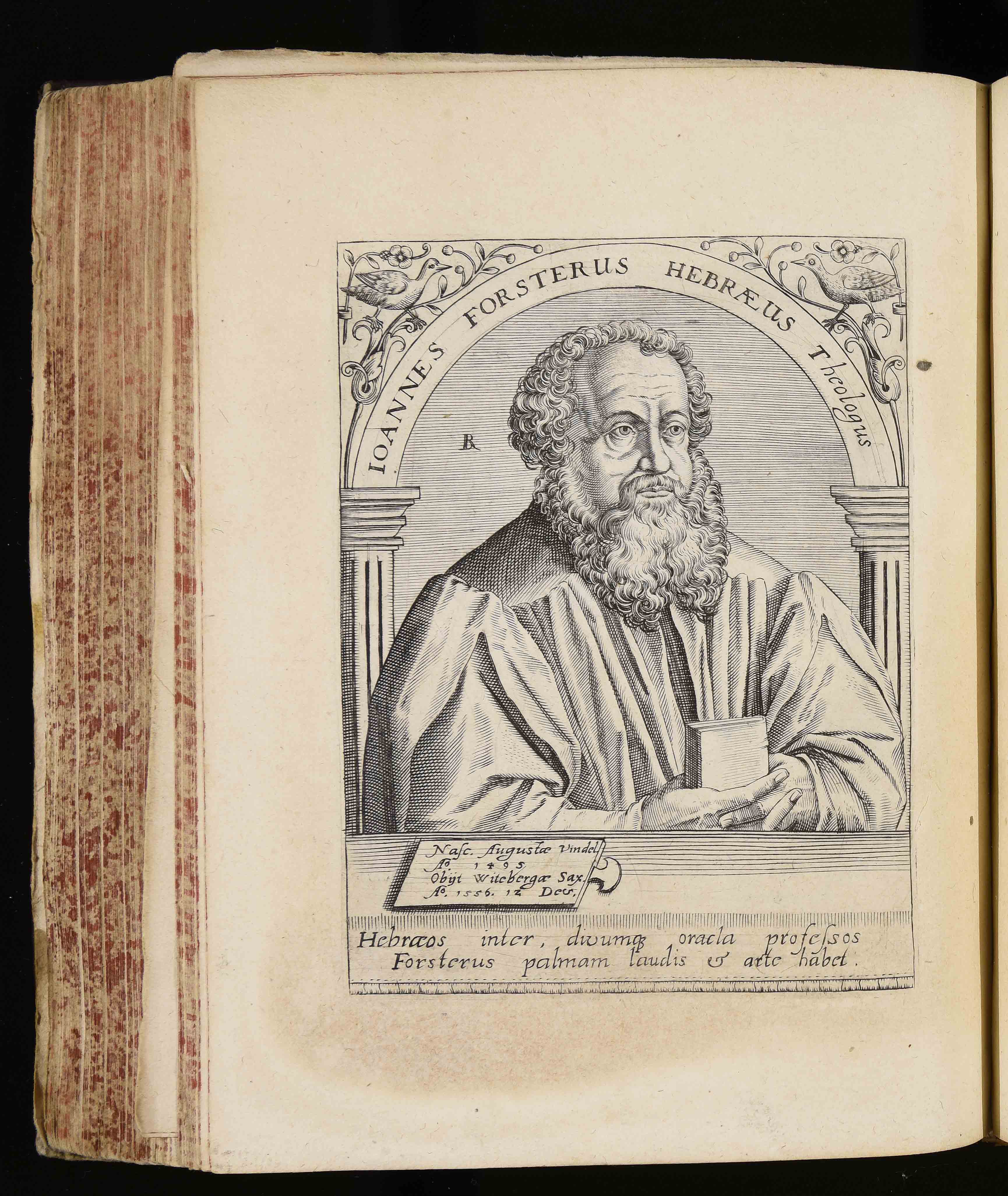 | Ioannes Forsterus hebraeus theologus. Nasc. Augustae Vindel. anno 1495. Obijt Witebergae Sax. anno 1556. 12 Decr. Hebraeos inter divumque oracla professos Forsterus palmam laudis et arte habet |