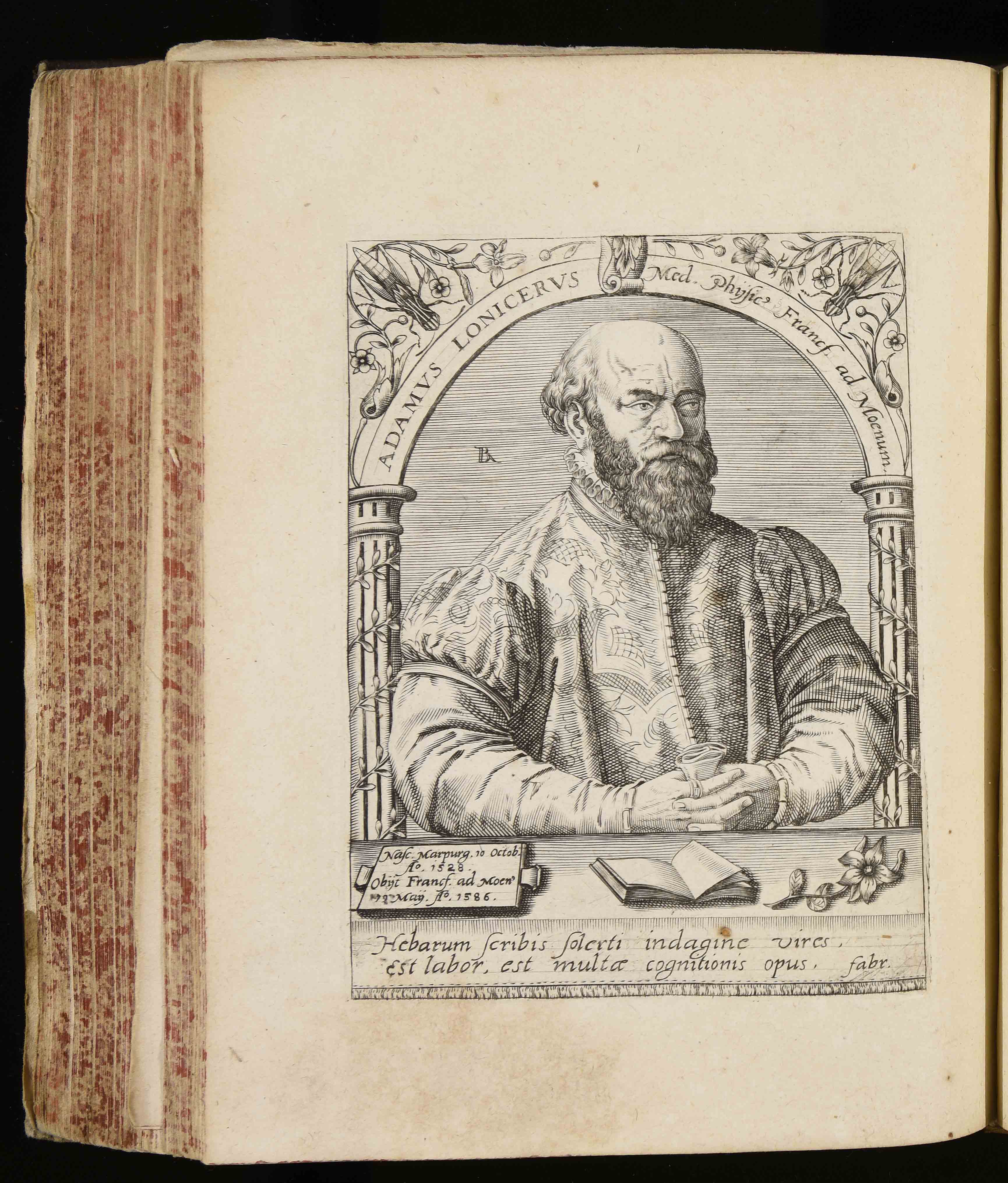 | Adamus Lonicerus med. phijsicus Francf. ad Moenum. Nasc. Marpurg. 10 Octob. anno 1528. Obijt Francf. ad Moenus 19 Maij. anno 1586. Hebarum scribis solerti indagine vires est labor est multae cognitionis opus fabr. |