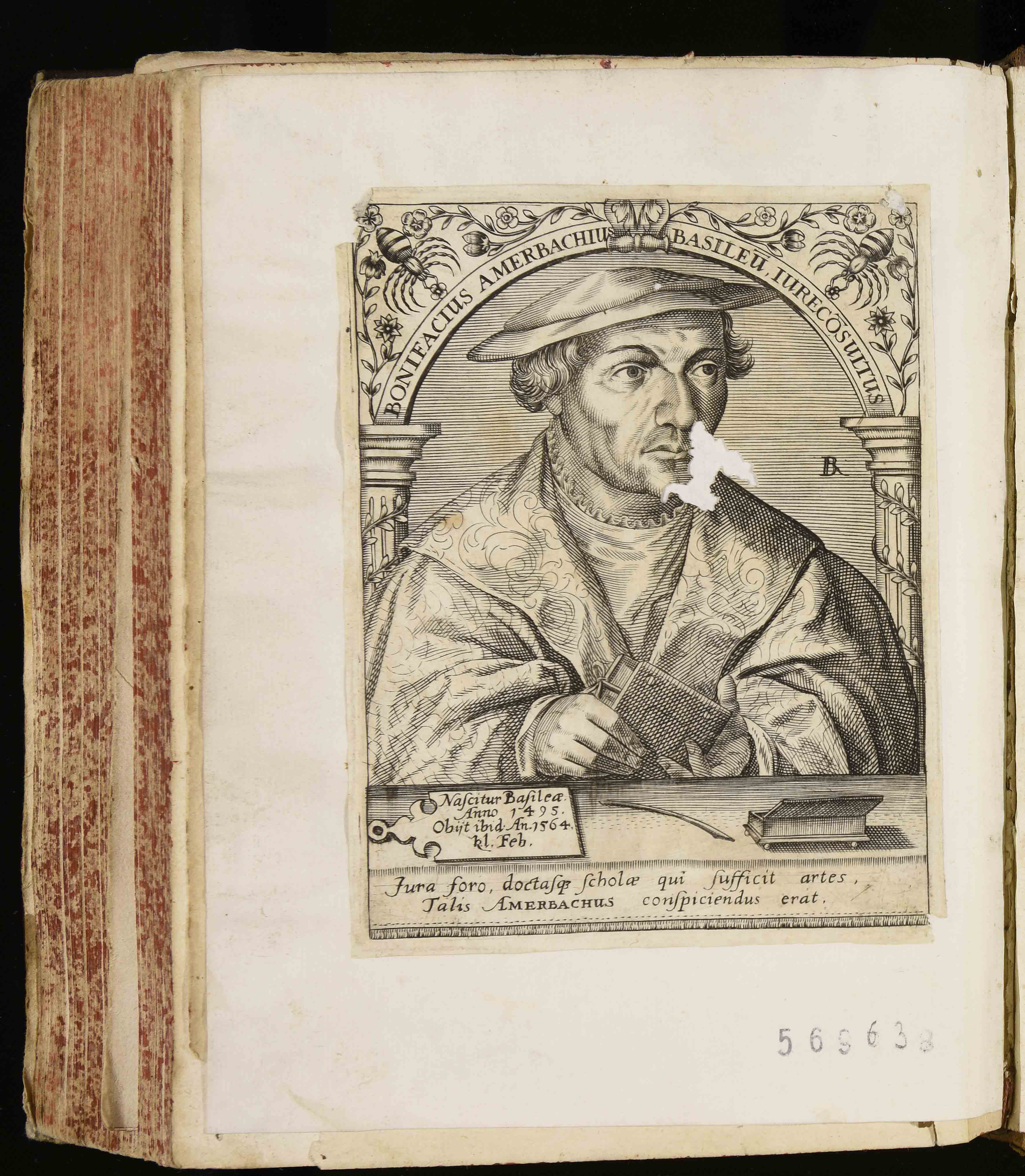| Bonifacius Amerbachius Basileus iureconsultus. Nascitur Basilae. anno 1495. Obiit ibid. an. 1564. kl. Feb. Iura foro doctasque scholae qui sufficit artes talis Amerbachius conspiciendus erat |