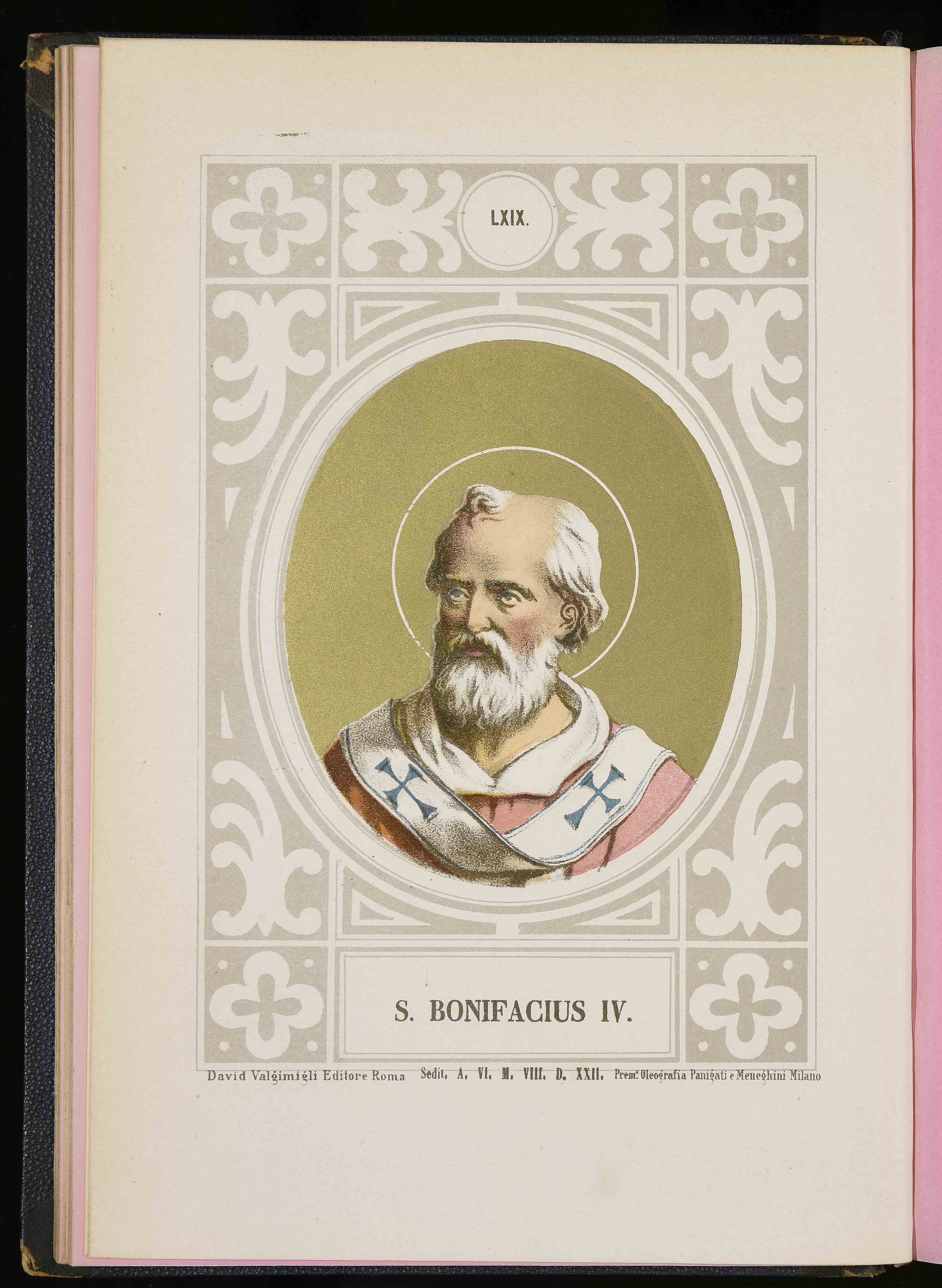 260x177 mm; in Luigi Tripepi, Ritratti e biografie dei romani pontefici: da S. Pietro a Leone XIII, Roma, Tipografia della Pace, 1879